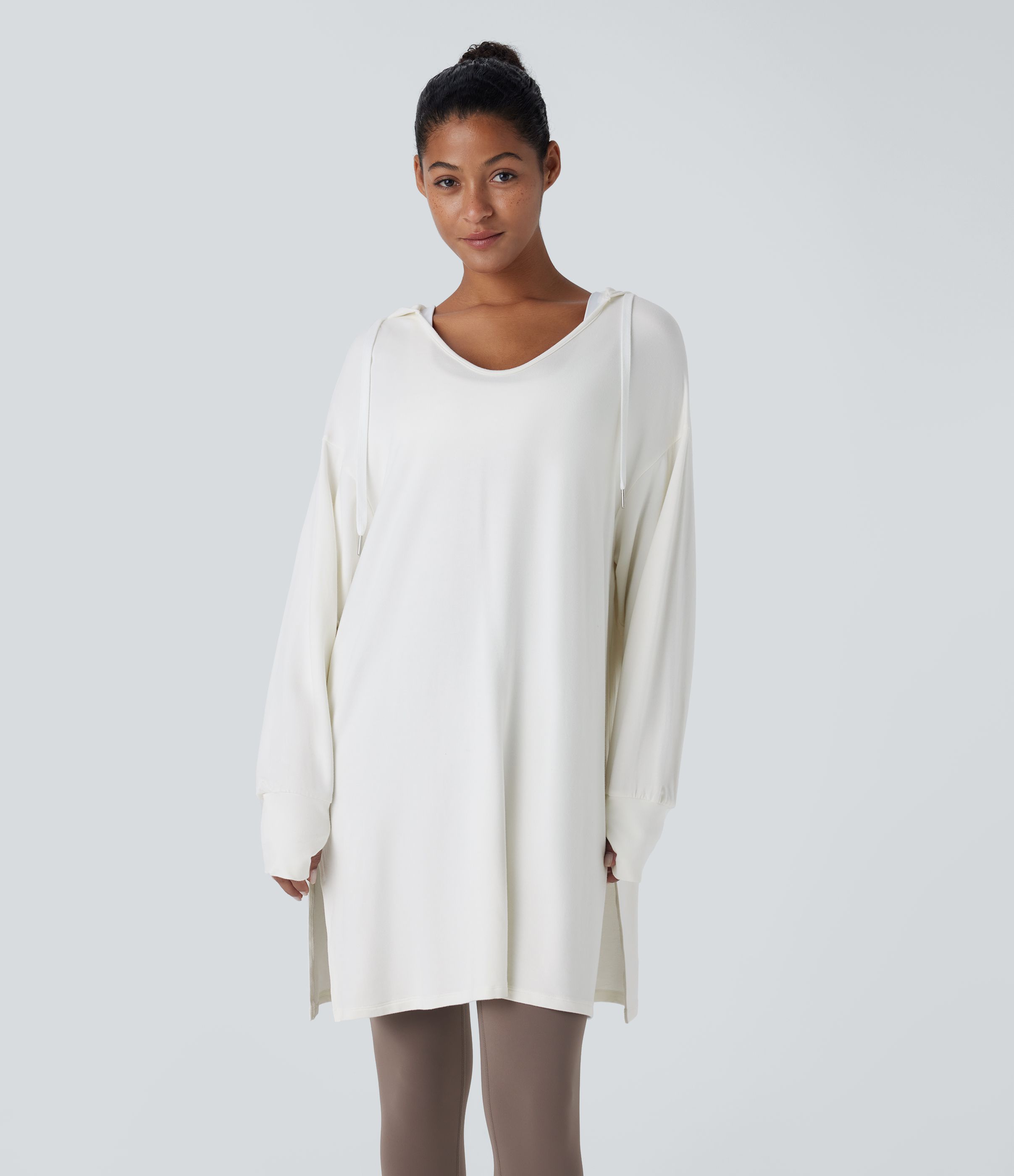 Hooded V Neck Drawstring Thumb Hole Longline Casual Sweatshirt
