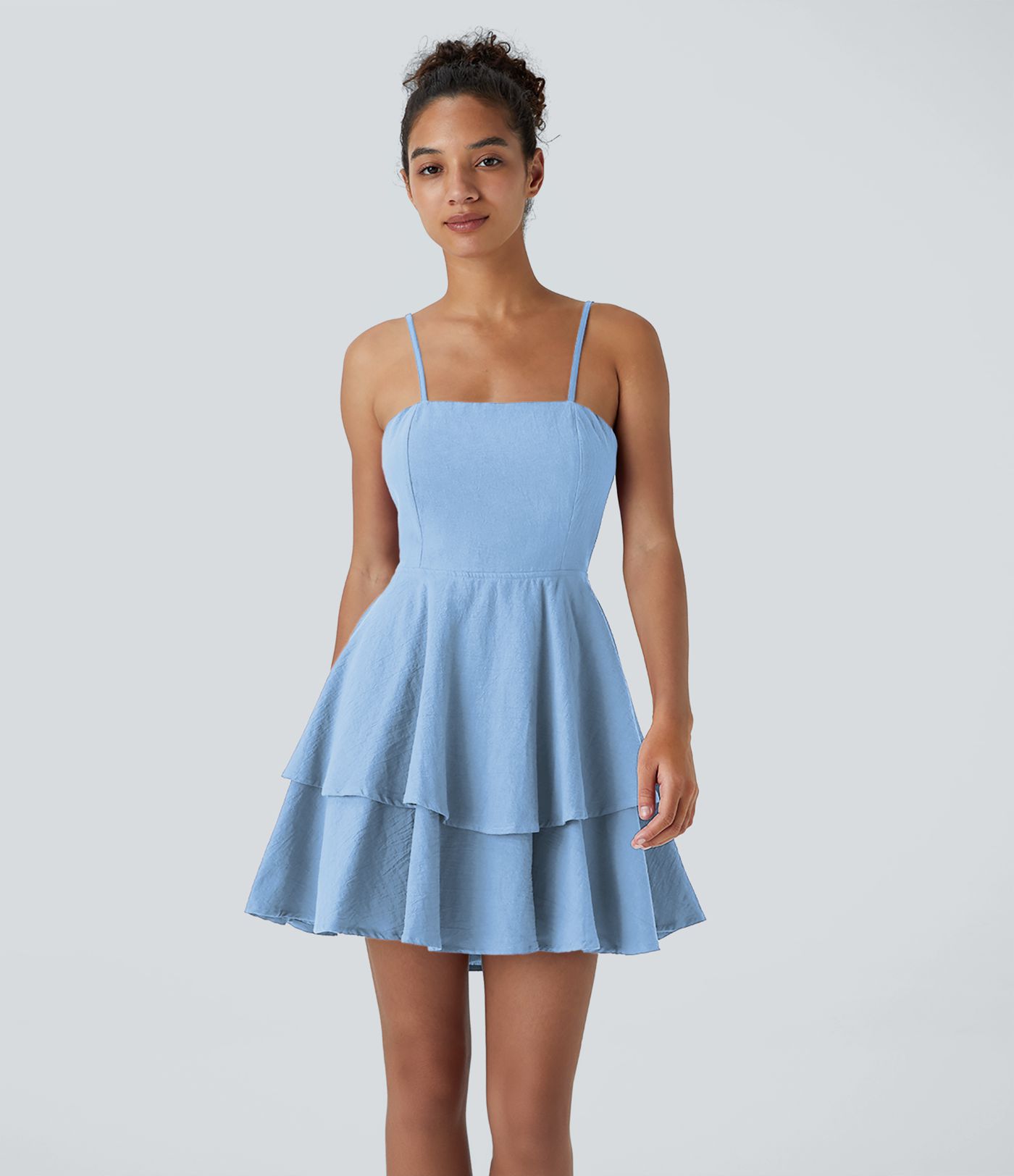 Tie Back Tiered Ruffle Flowy Slip Mini Casual Linen-Feel Dress