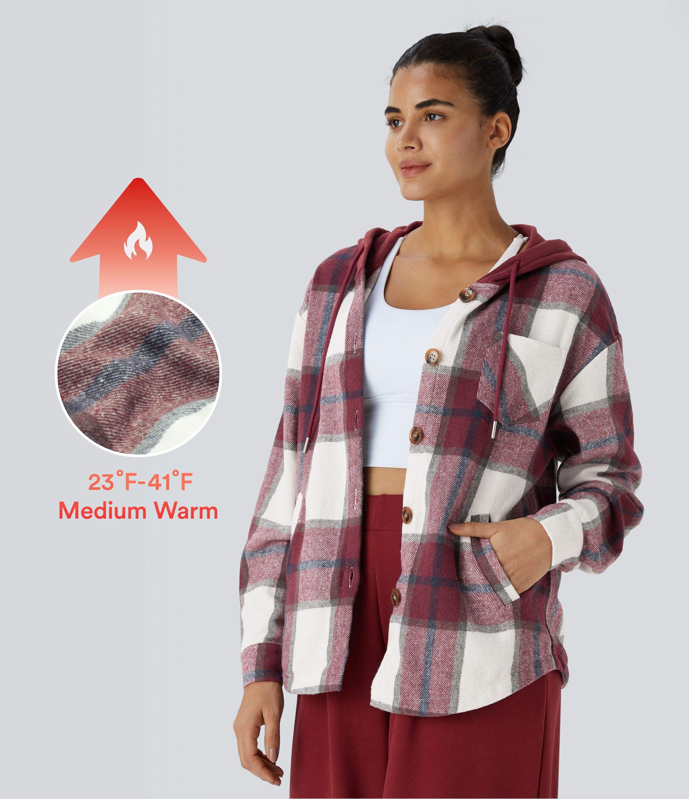 Hooded Drawstring Pocket Plaid Thermal Casual Jacket