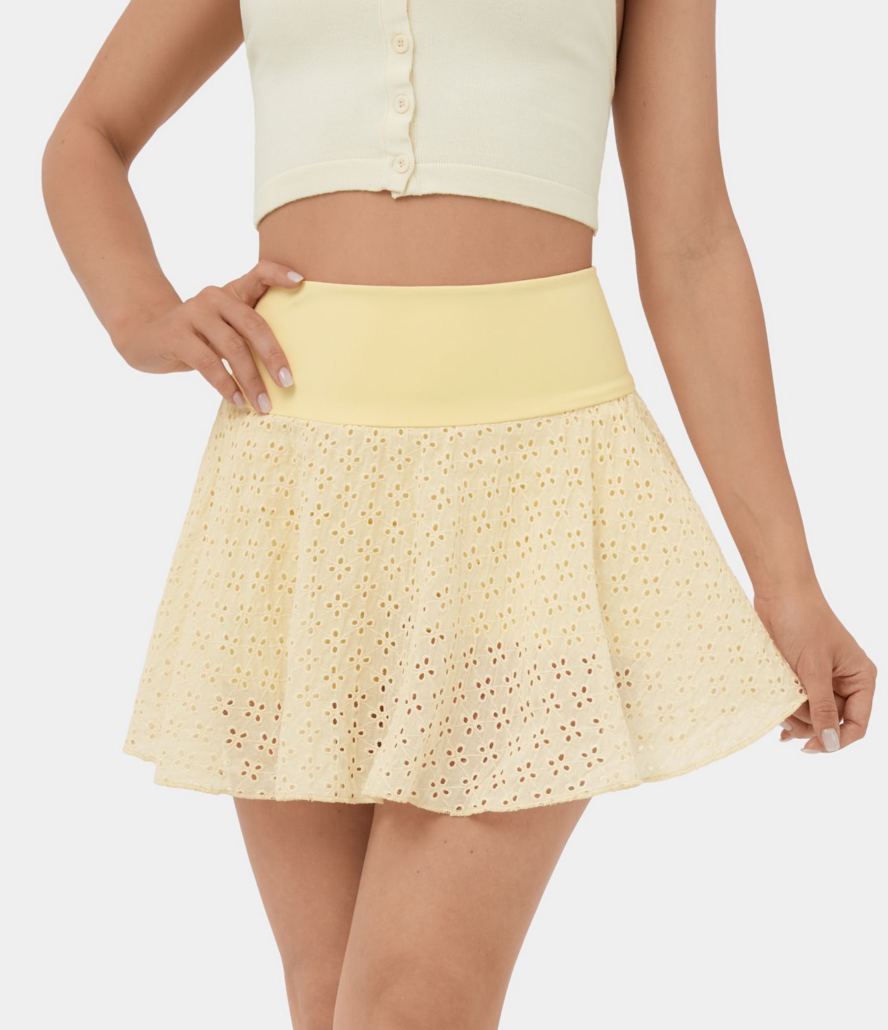 High Waisted 2-in-1 Side Pocket Cut Out Jacquard Mini Flare Casual Skirt