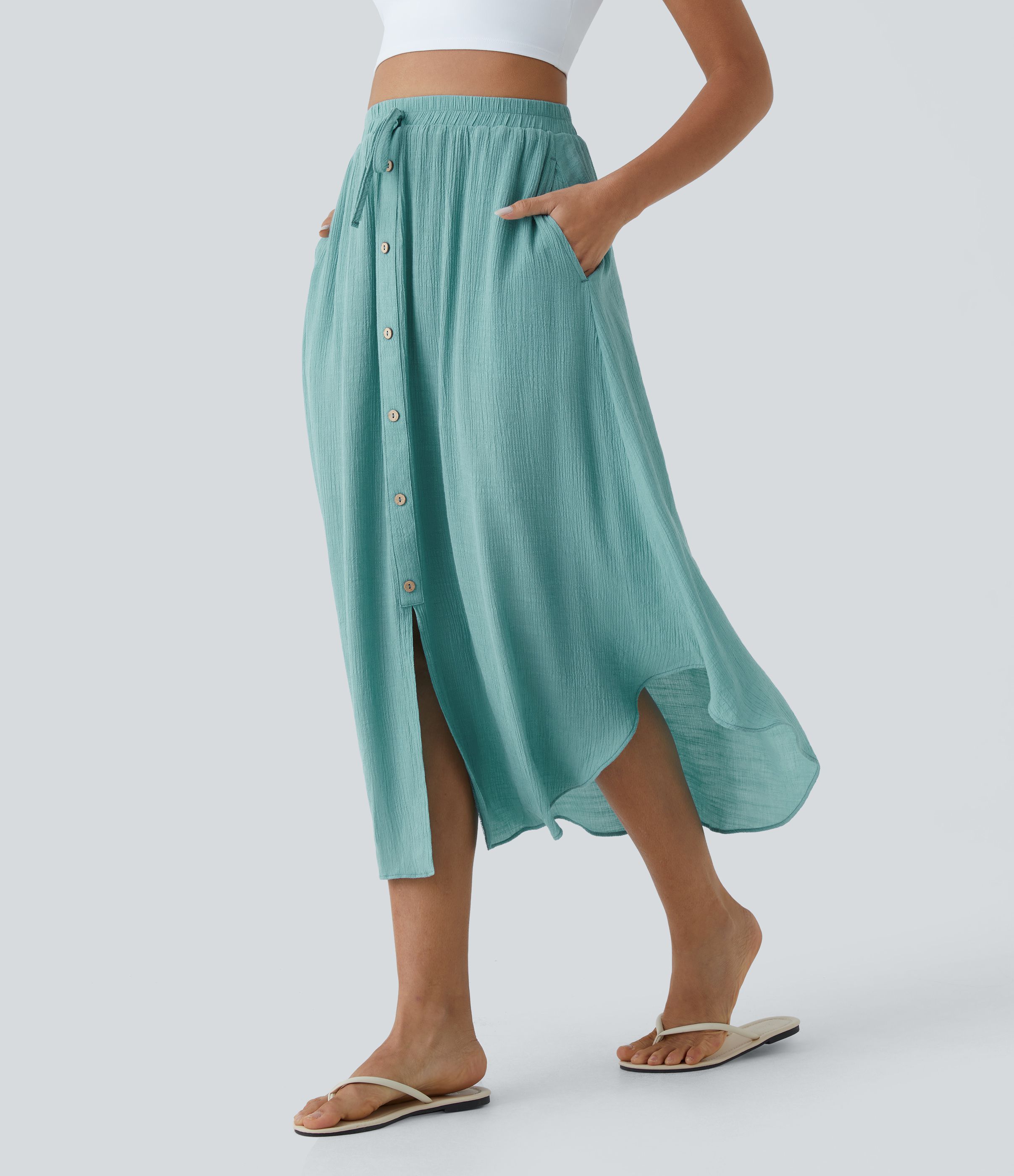 High Waisted Drawstring Pocket Flowy Midi Casual Skirt