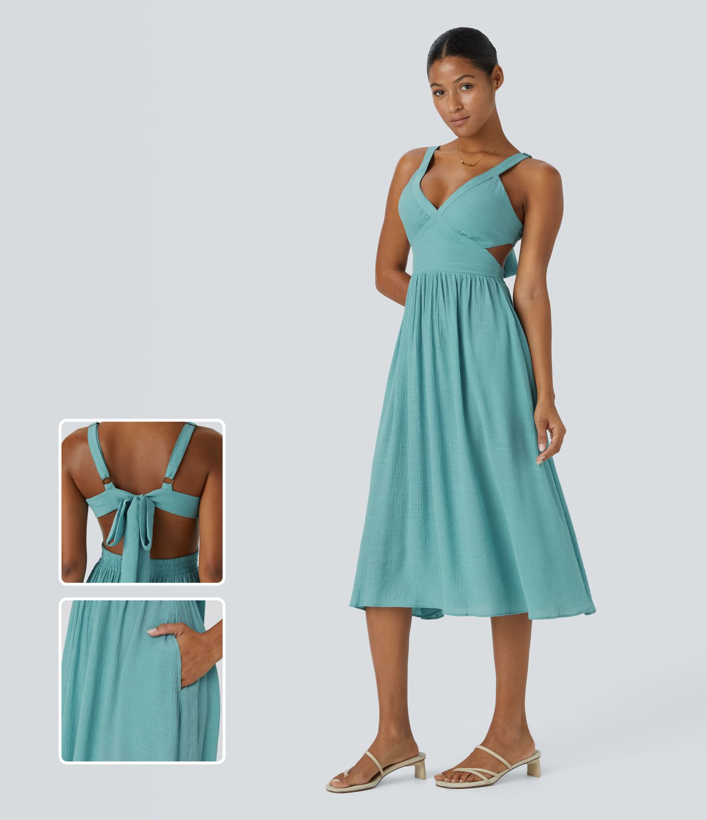 Deep V Neck Sleeveless Tie Back Cut Out Pocket Flowy Casual Midi Dress