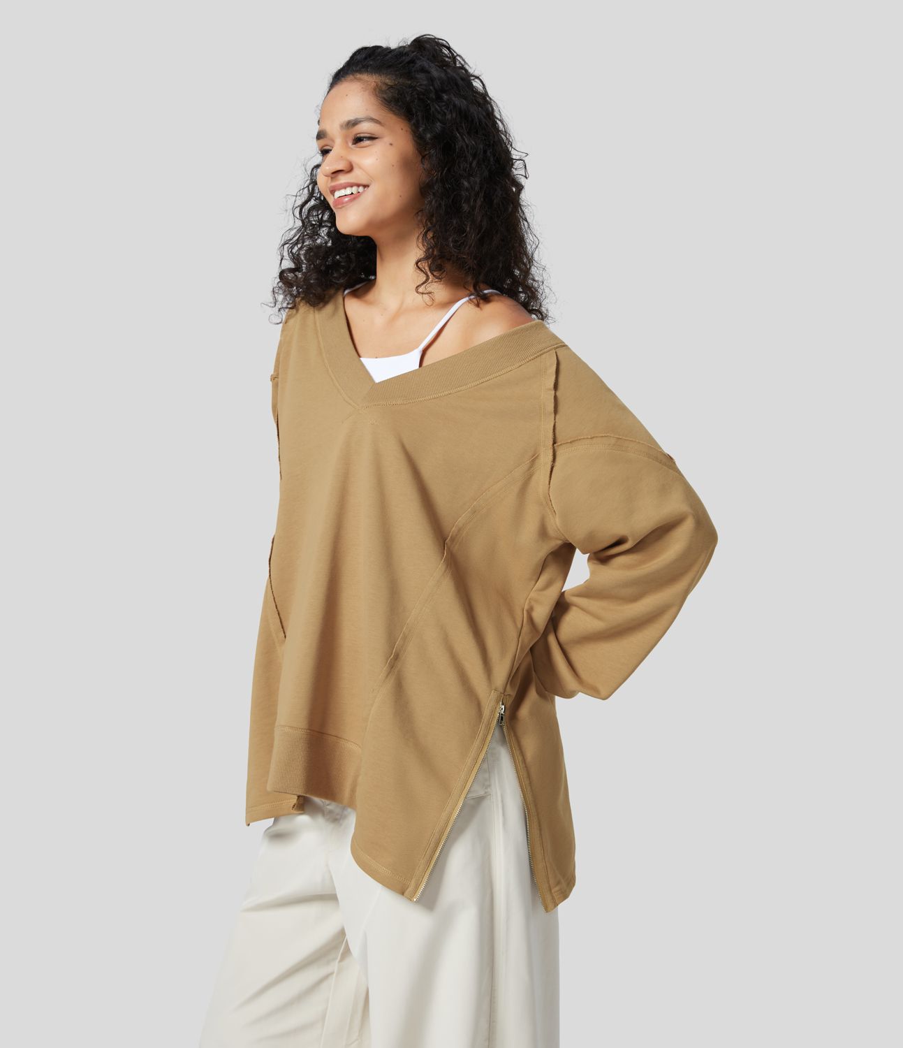 V Neck Long Sleeve Adjustable Zipper Hem Casual Cotton Sports Sweatshirt
