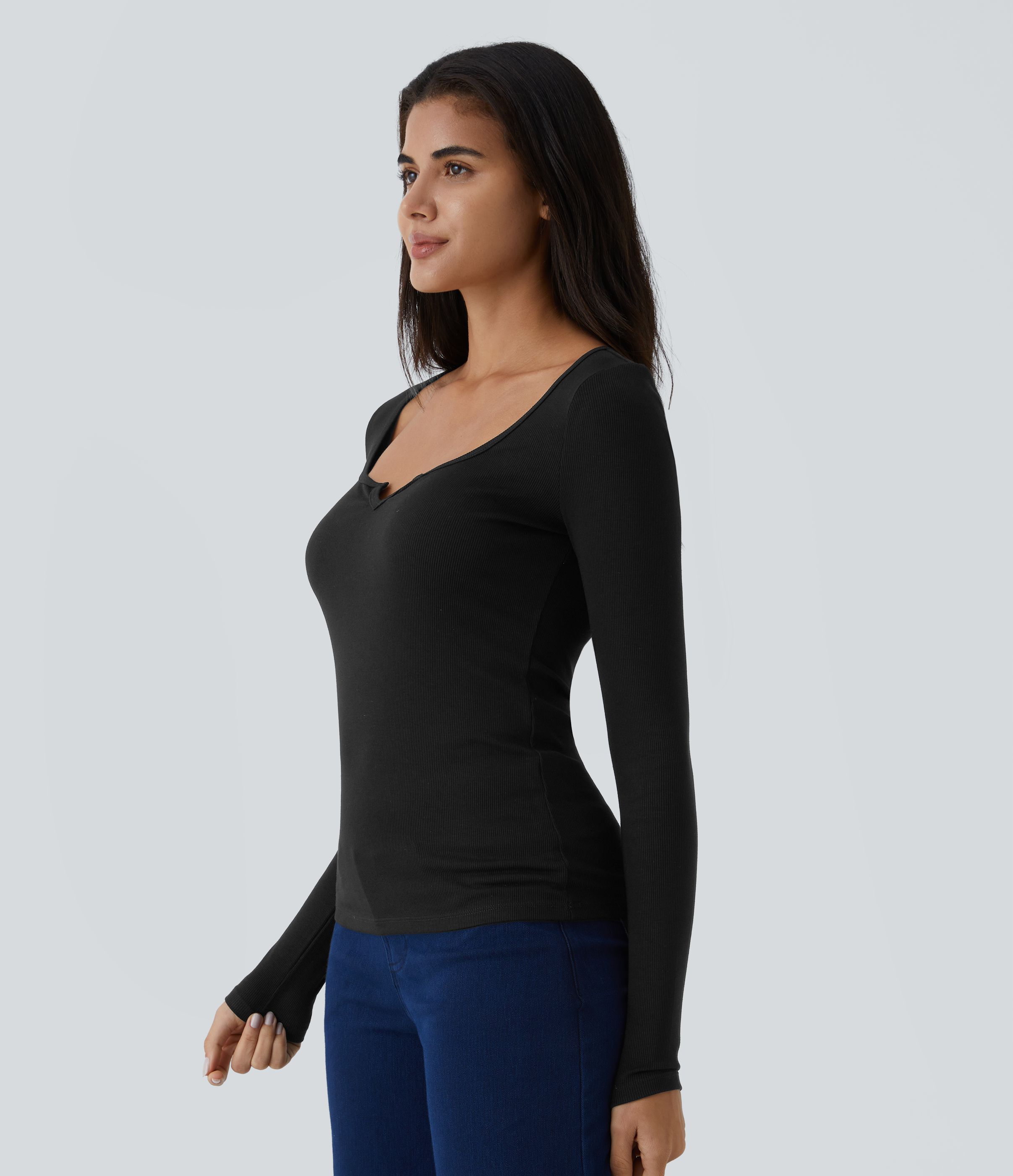 Ribbed Scoop Neck Long Sleeve Slim Casual Top