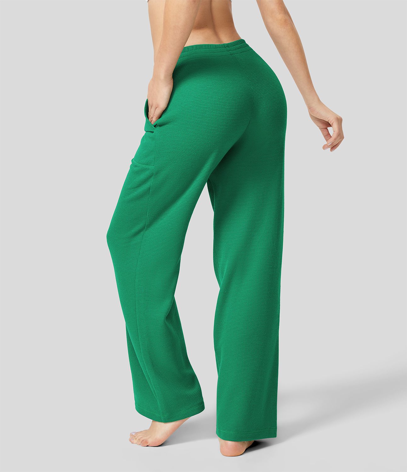 Mid Rise Side Pocket Straight Leg Waffle Casual Cotton Pants