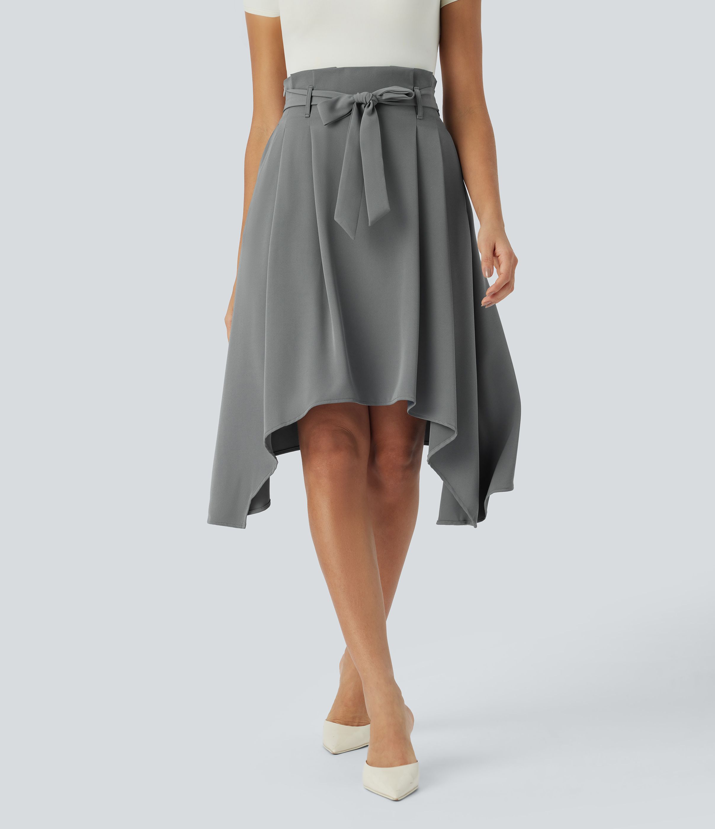 Paper Bag High Waisted Belted Pocket Hanky Hem Midi Work Skirt