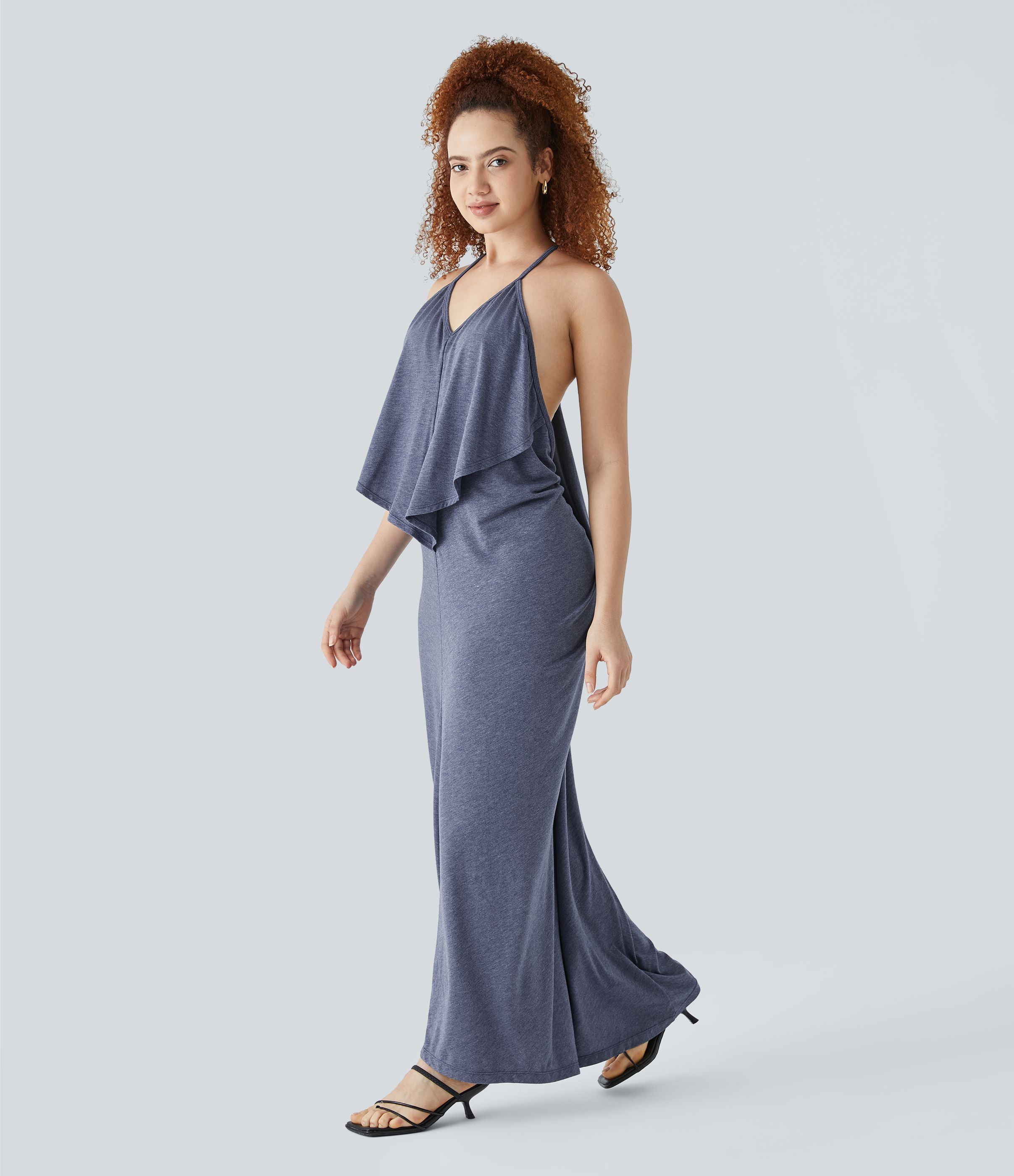 V Neck Tie Back Ruched Maxi Slip Dress