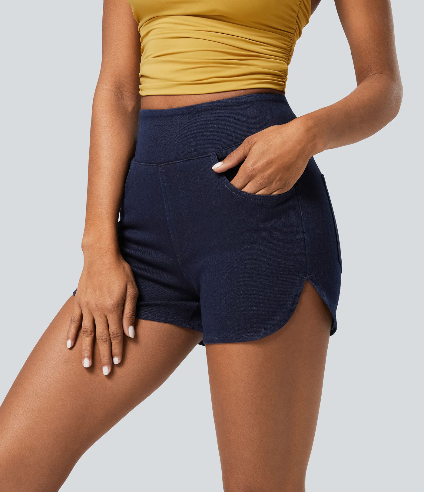 Halara Flex™ High Waisted Pockets Curved Hem Skinny Washed Denim Casual Shorts 3''