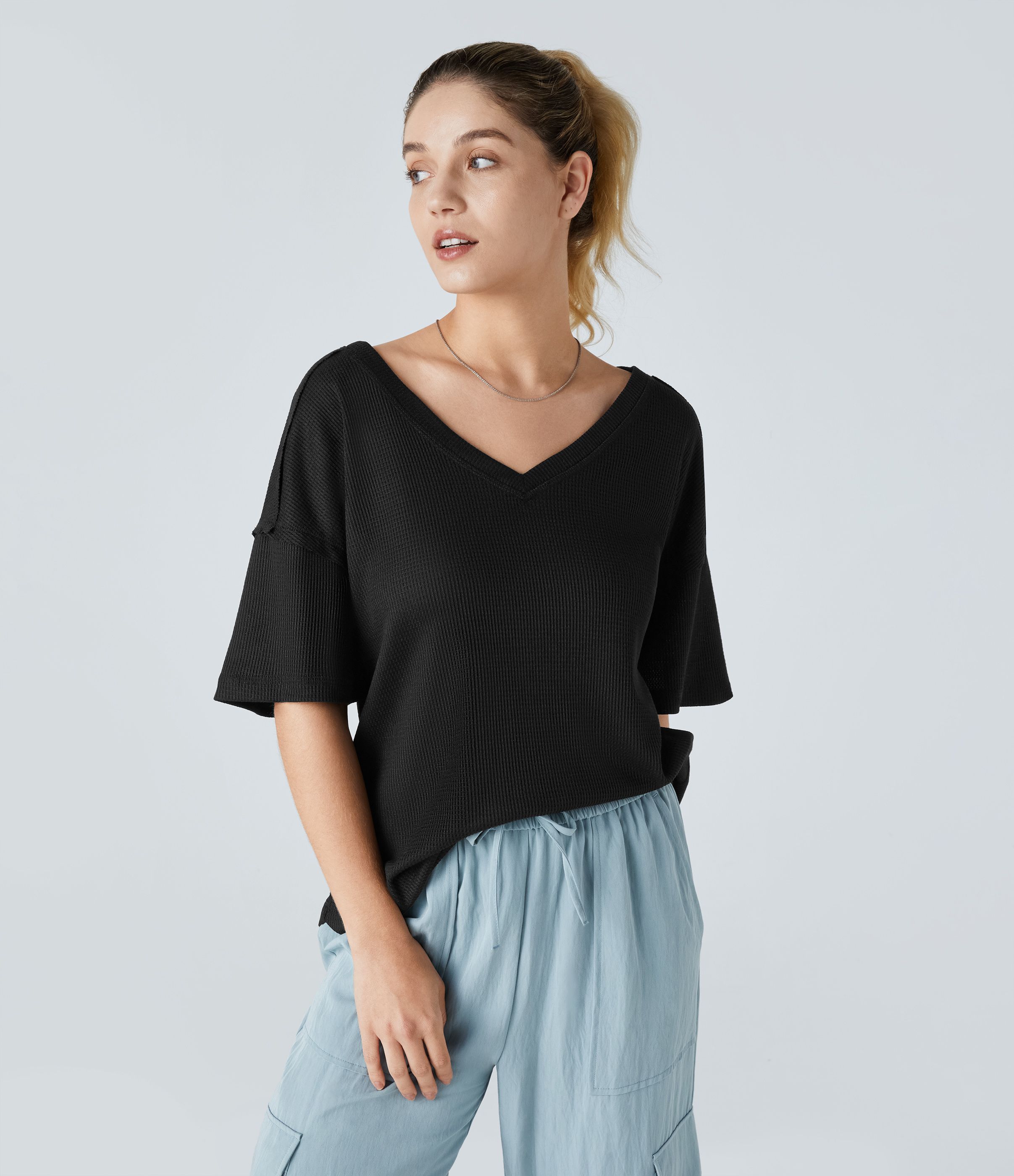 V Neck Dropped Shoulder Curved Hem Relaxed Waffle Casual T-Shirt