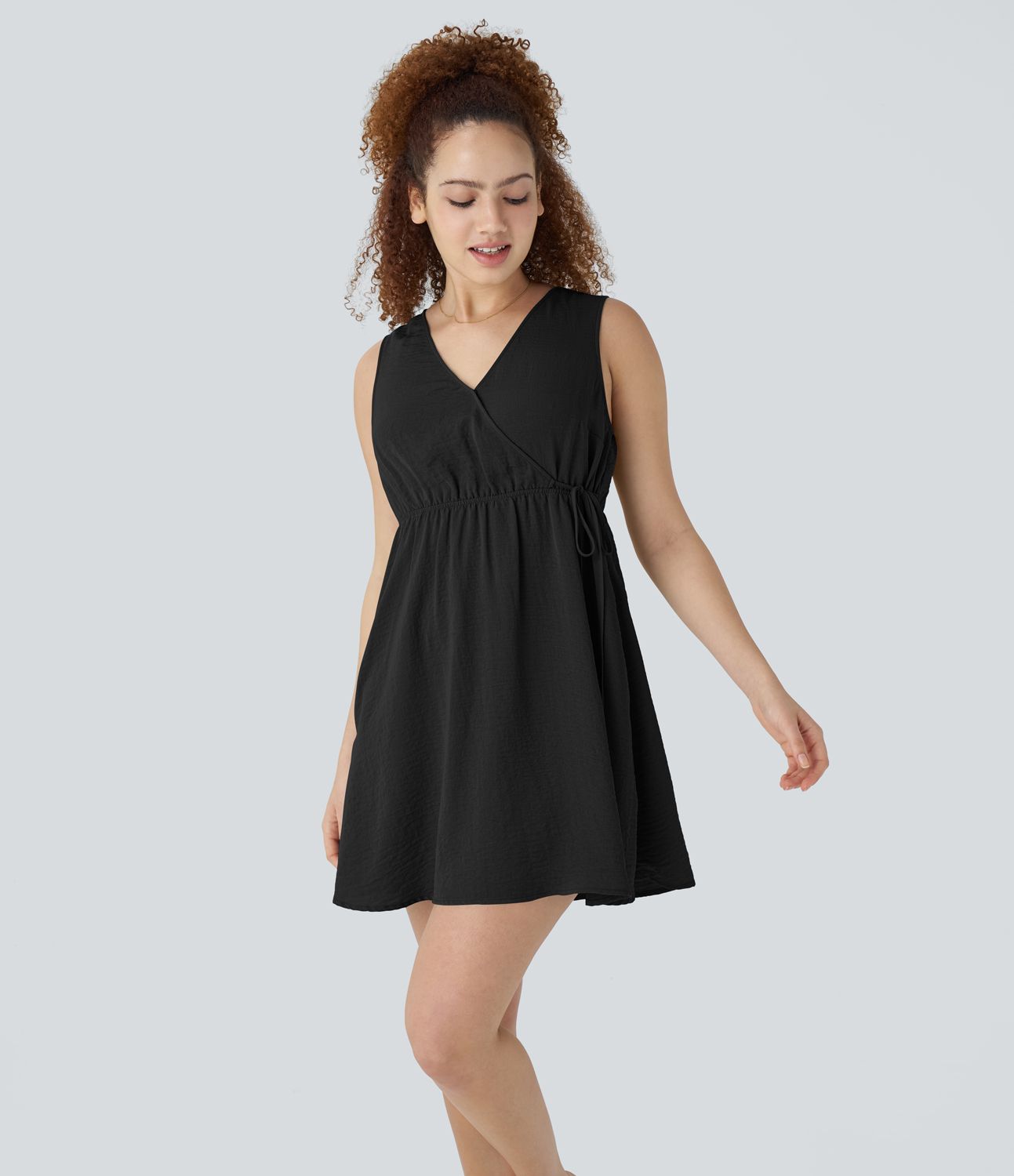 V Neck Sleeveless Tie Pocket Linen-Feel Mini Casual Dress