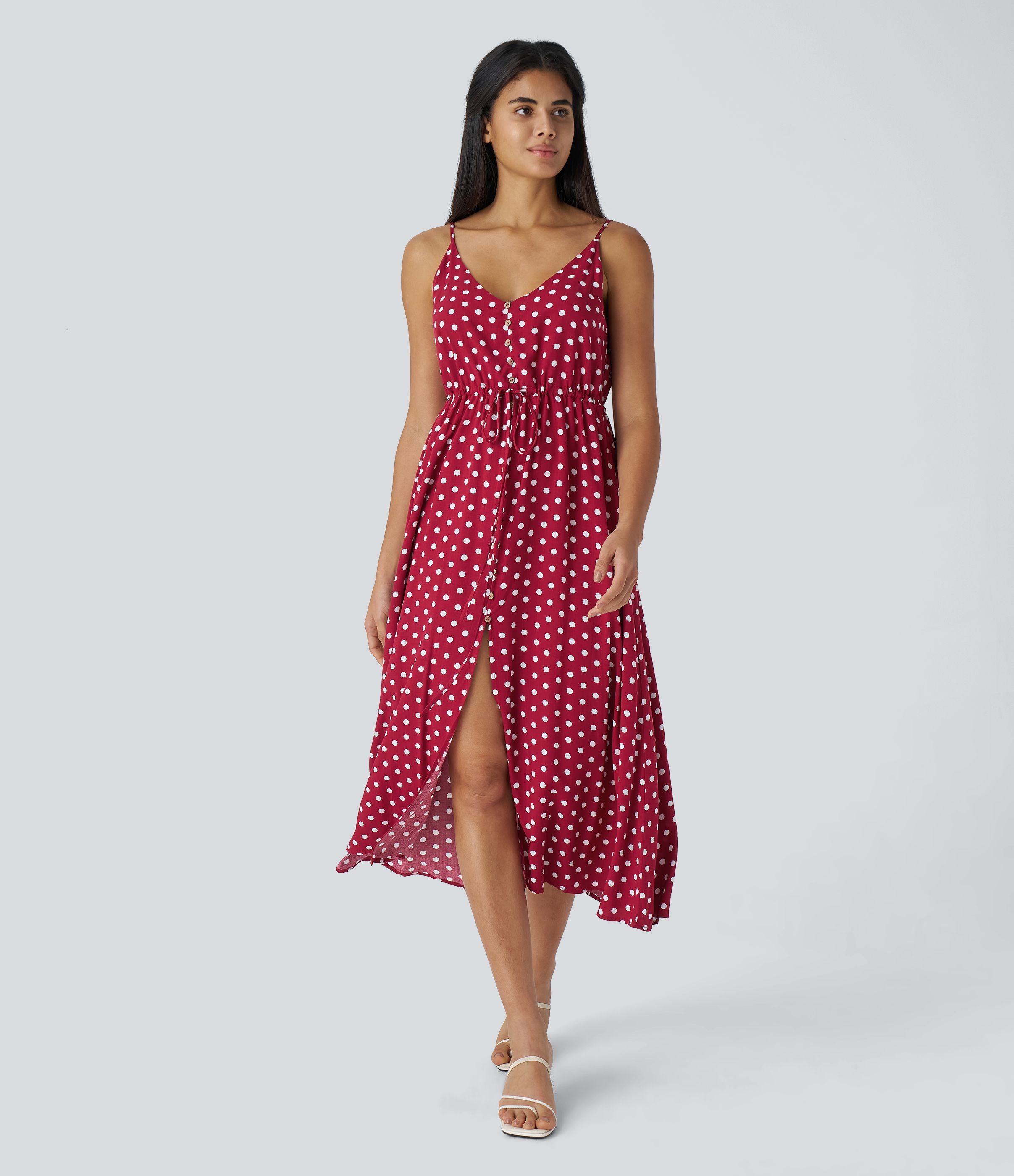 Decorative Drawstring Polka Dot Midi Slip Dress