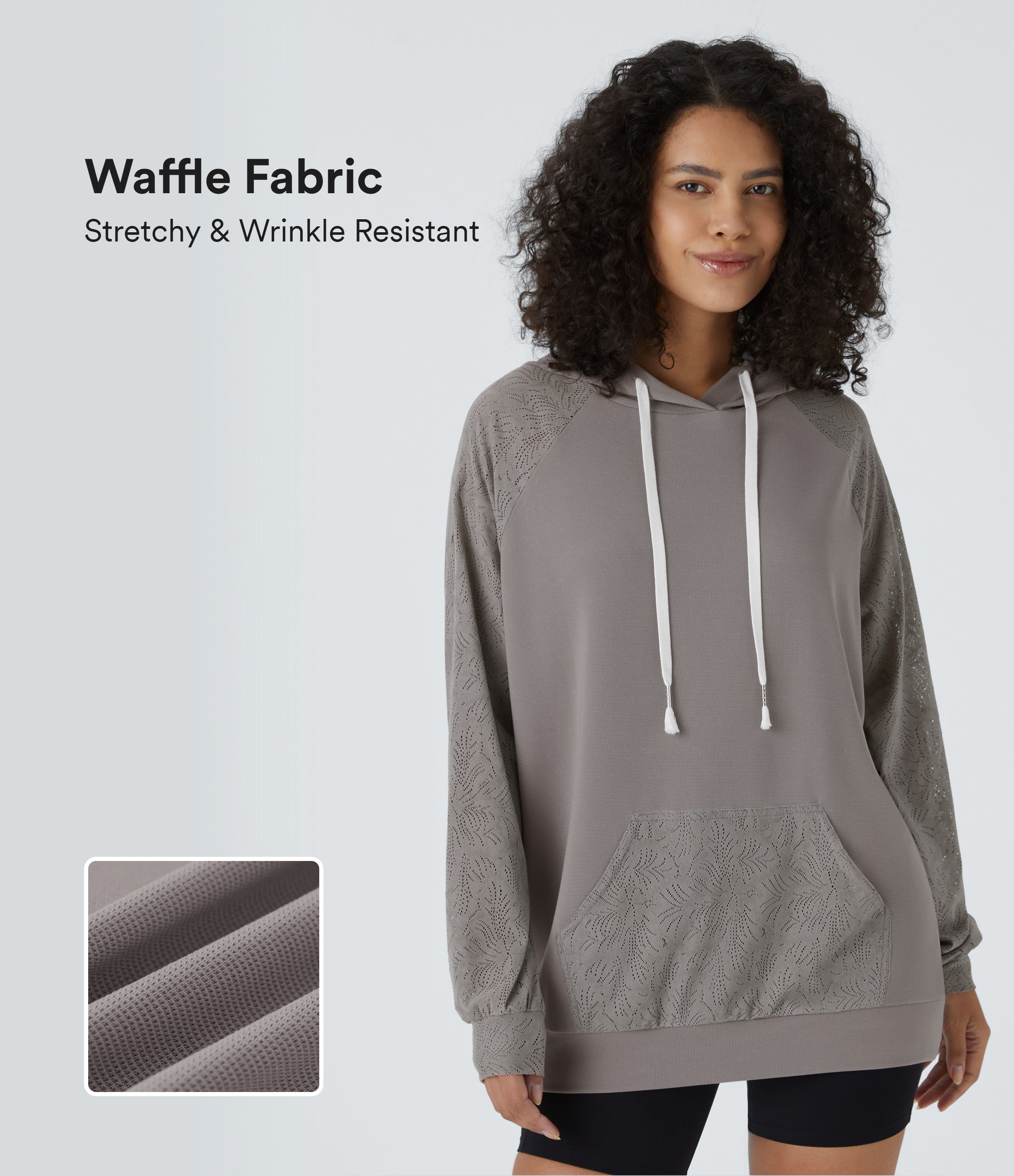 Hooded Drawstring Long Sleeve Kangaroo Pocket Contrast Lace Waffle Casual Hoodie Sweatshirt