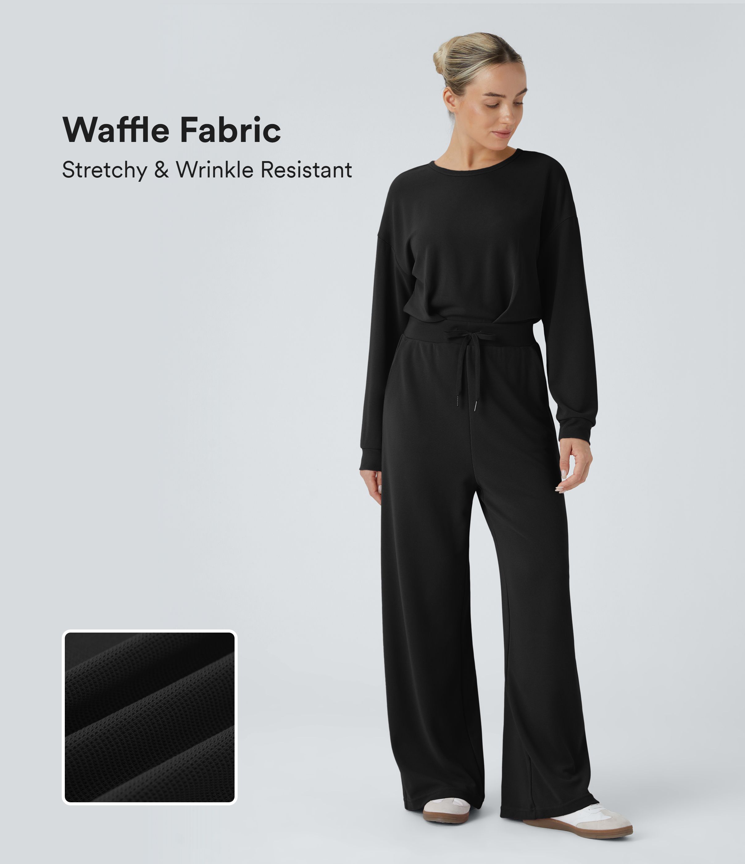 Round Neck Back Drawstring Pocket Waffle Casual Jumpsuit