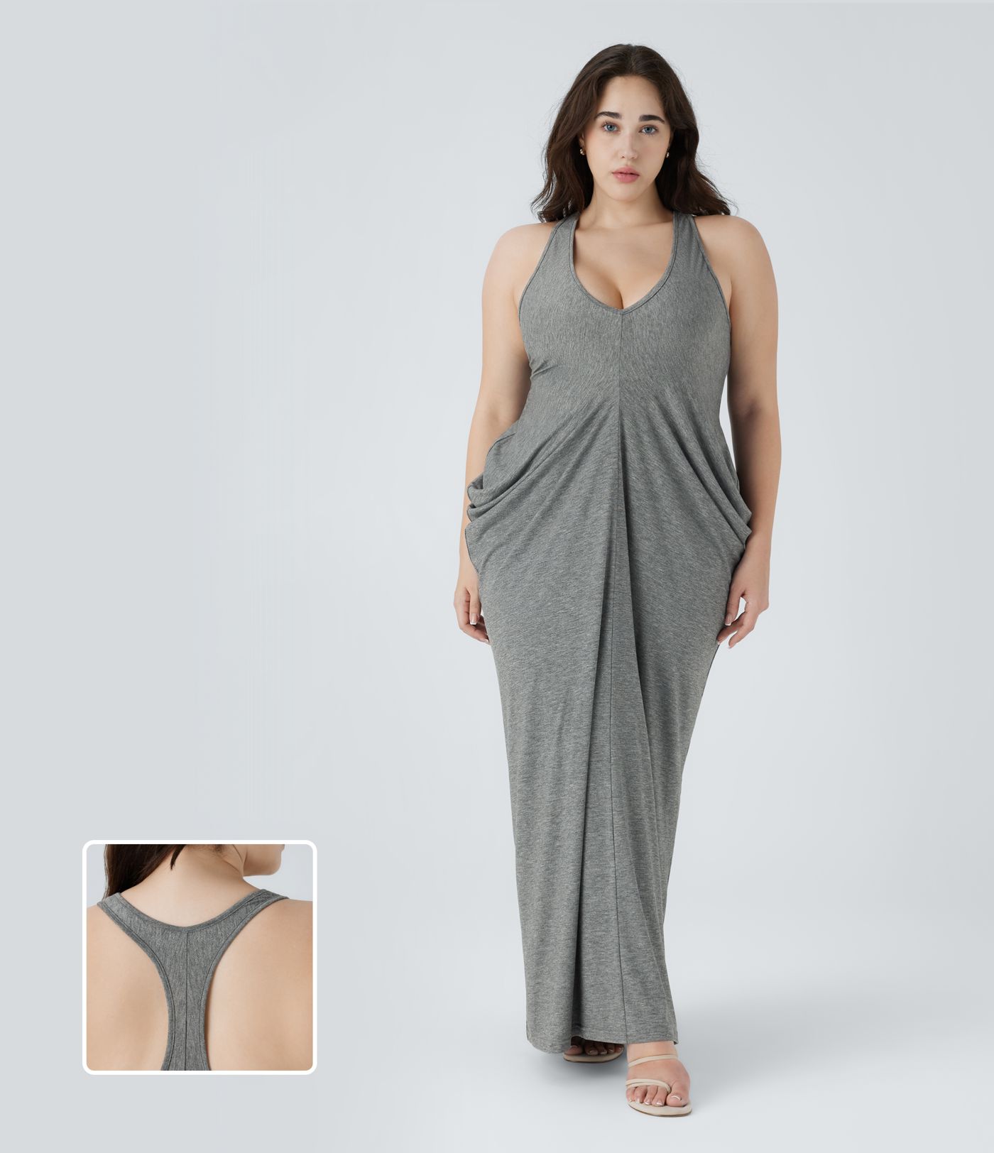 Deep V Neck Racerback Stacked Ruched Maxi Casual Plus Size Dress