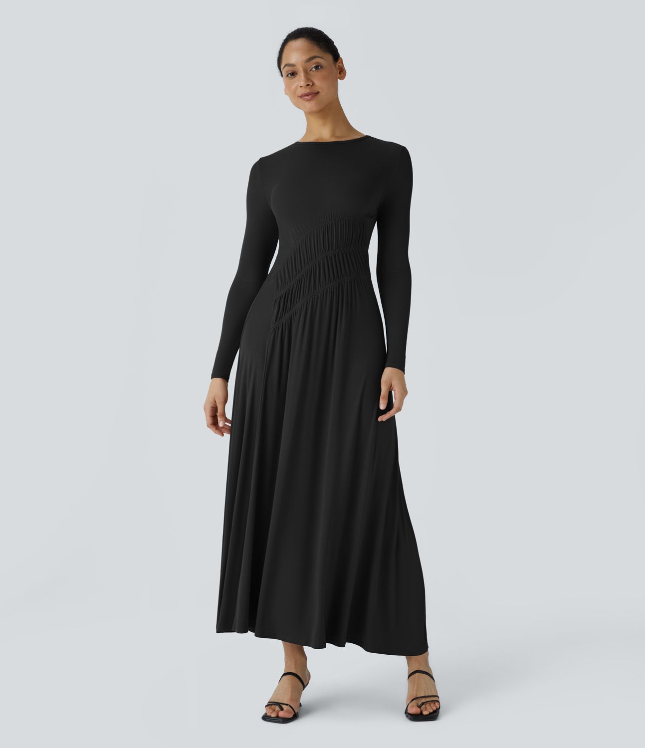 Ribbed Round Neck Long Sleeve Flare Flowy Maxi Casual Dress