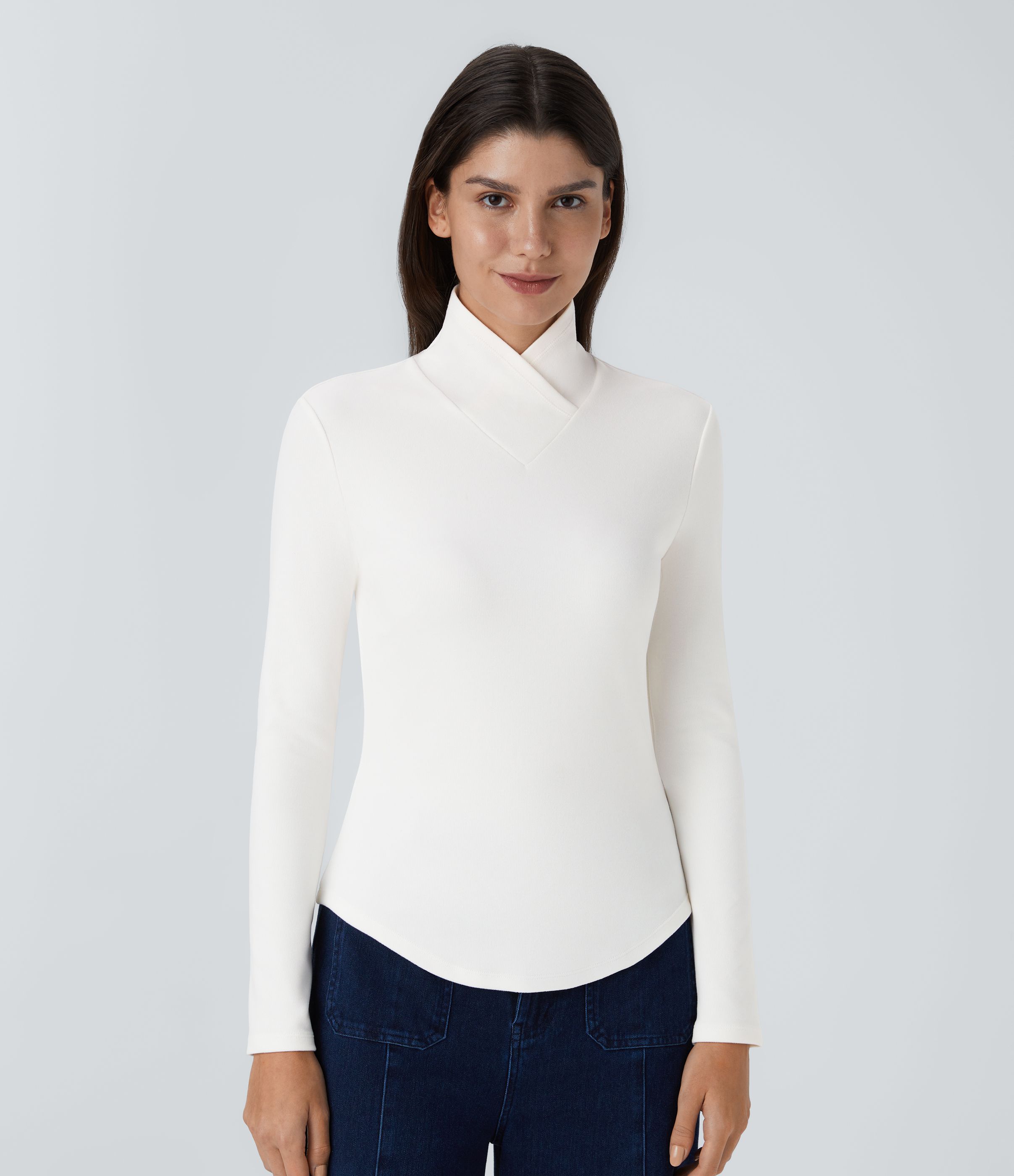 Crossover High Neck Long Sleeve Curved Hem Casual Top