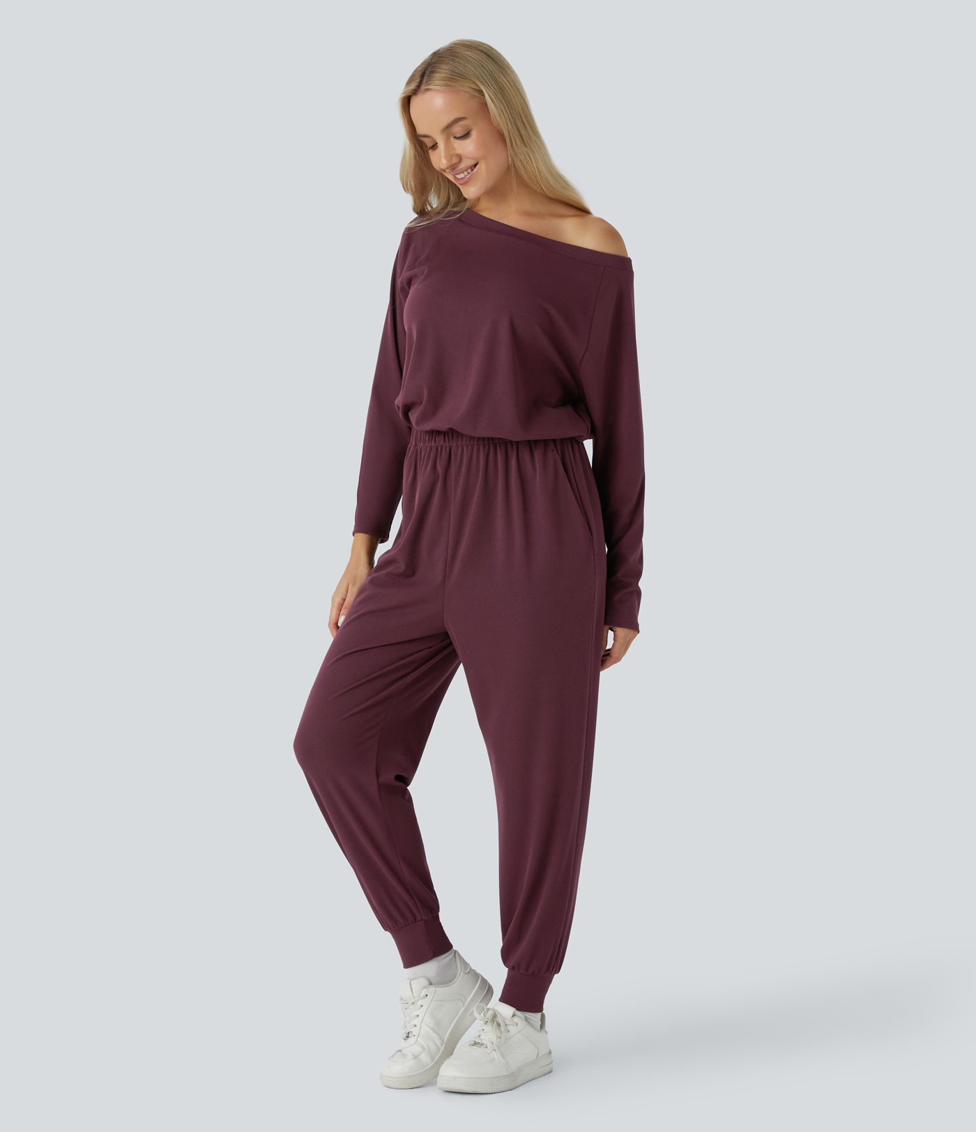 Off Shoulder Long Sleeve Pocket Waffle Casual Jumpsuit
