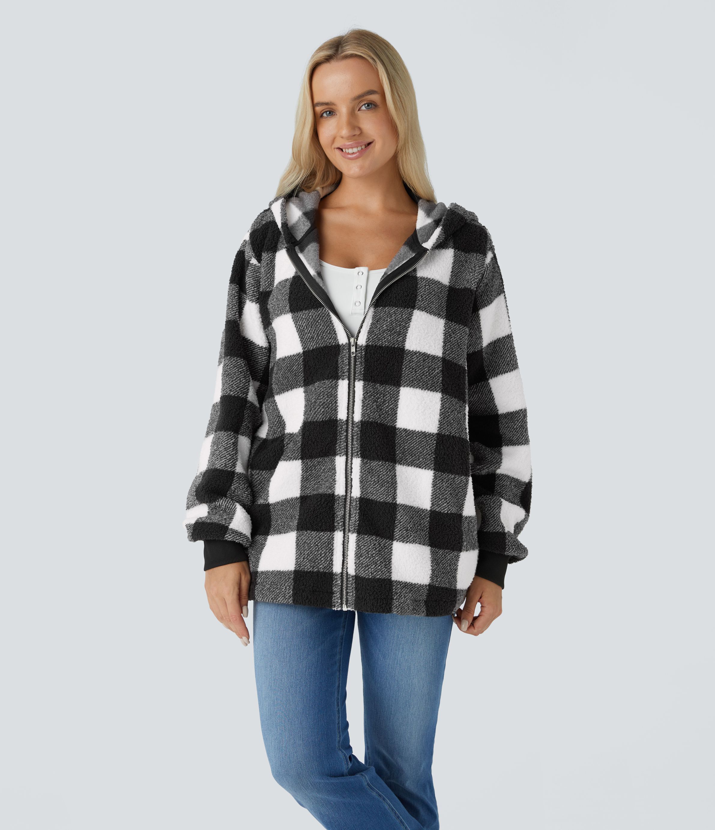 Hooded Long Sleeve Pocket Zipper Plaid Fleece Relaxed Casual Jacket