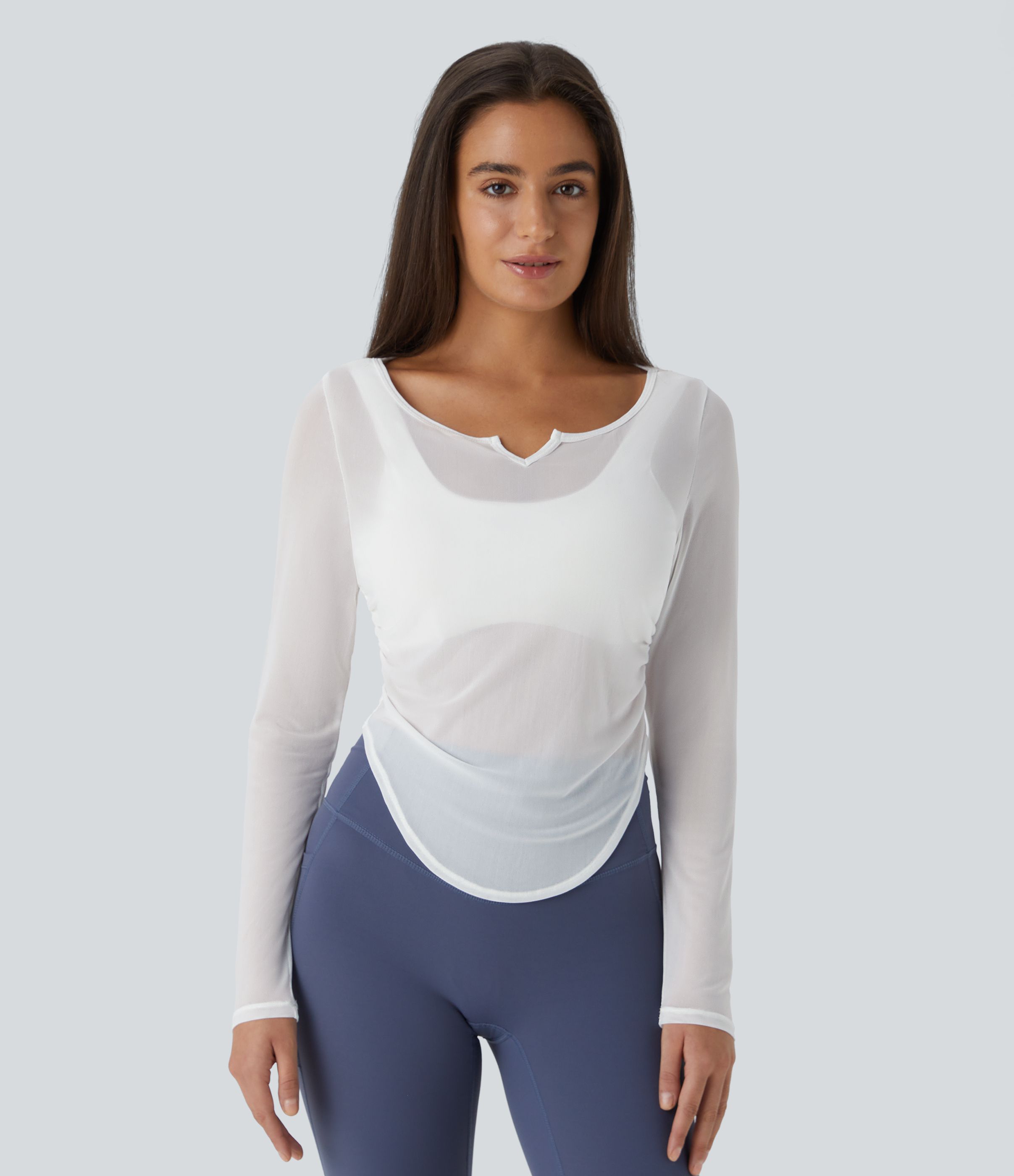 Sheer Mesh V Notch Long Sleeve Ruched Curved Hem Yoga Sports Top