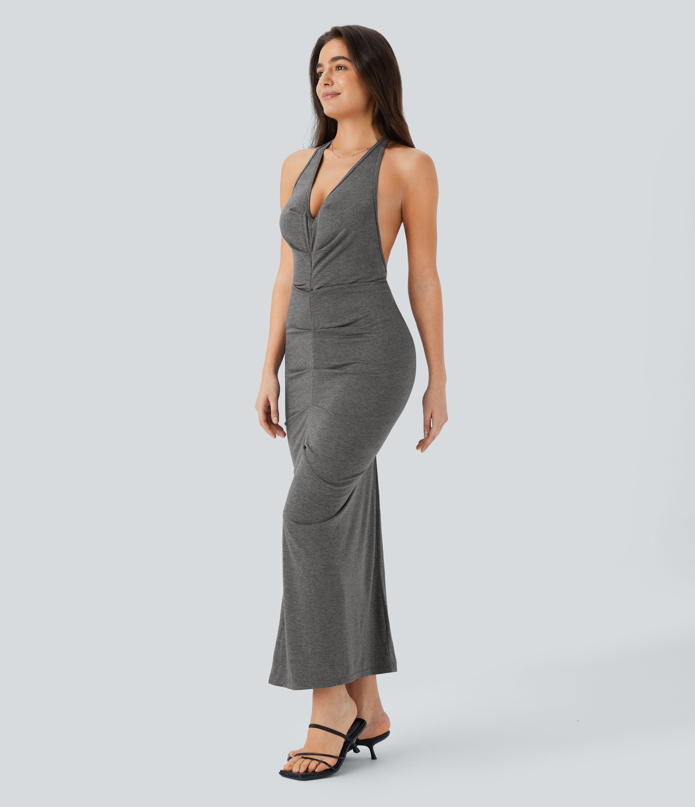Deep V Neck Halter Tie Ruched Midi Casual Dress
