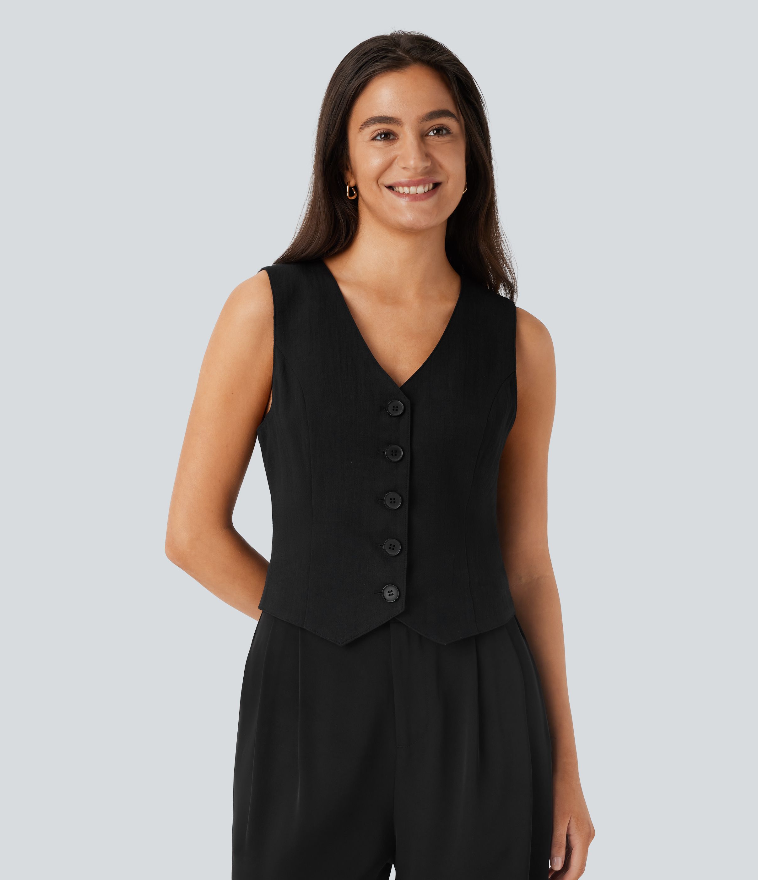 V Neck Front Adjustable Buckle Work Linen-Feel Vest