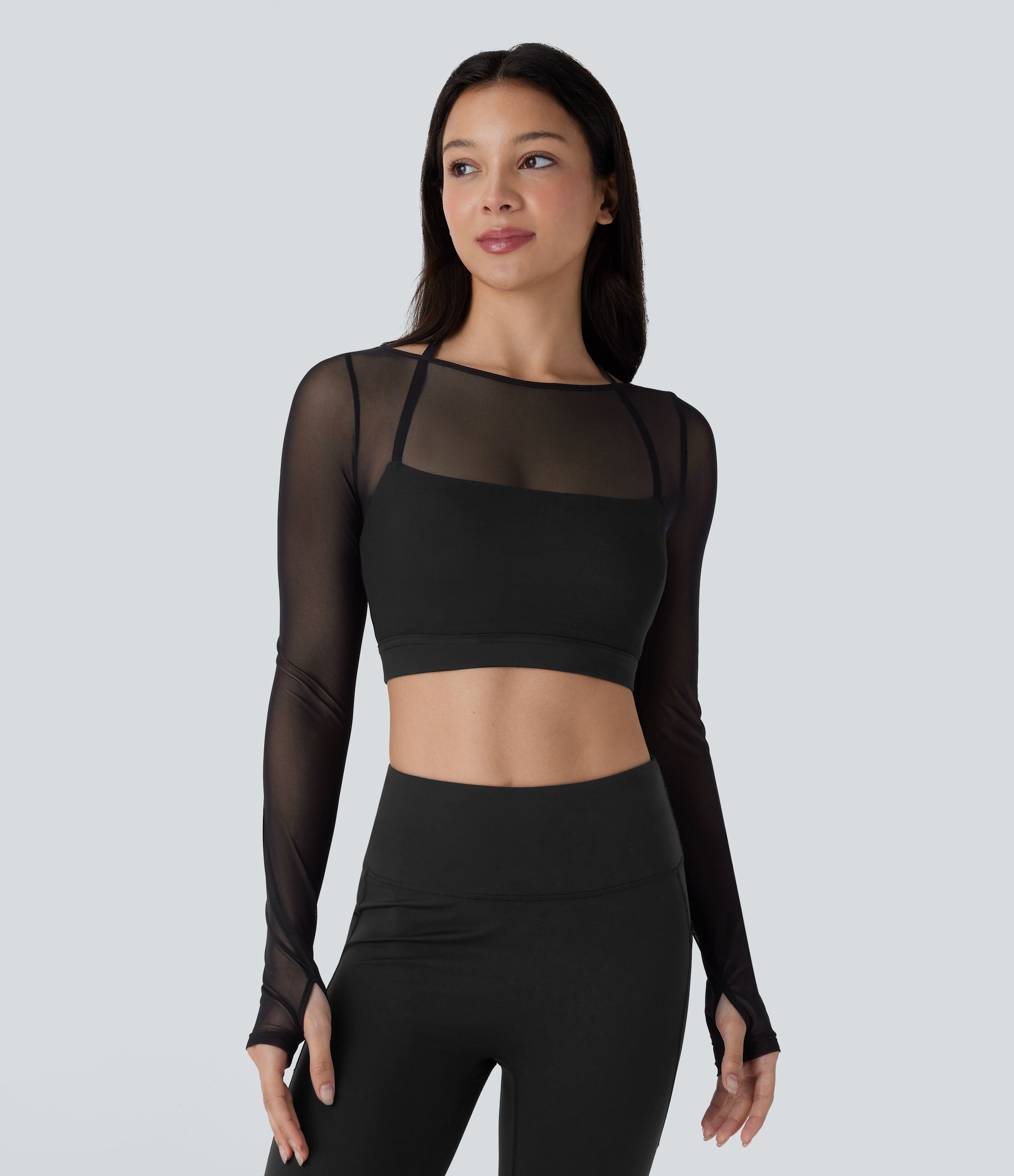 Halter Long Sleeve Thumb Hole Contrast Mesh 2-in-1 Cropped Yoga Sports Top