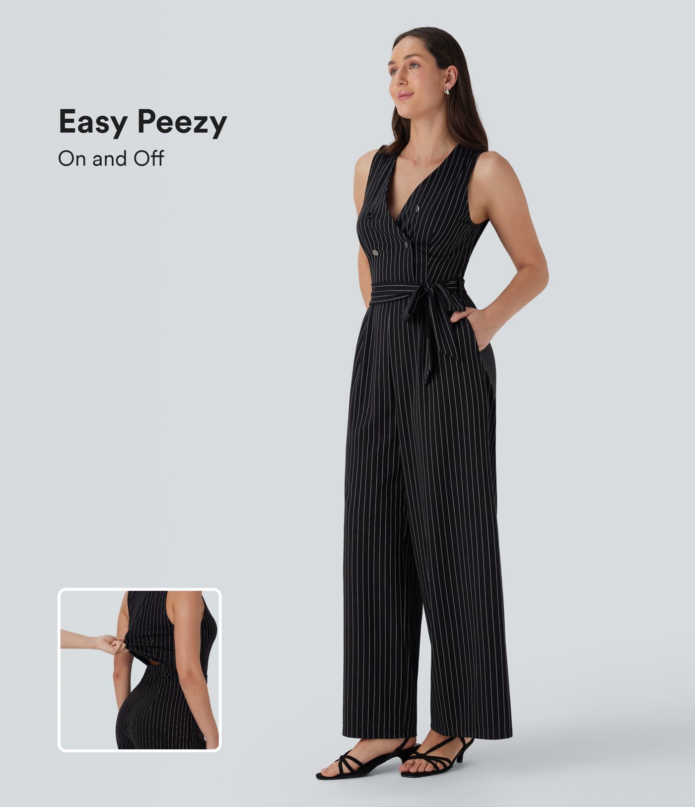 V Neck Sleeveless Belted Stripe Cool Touch Work Jumpsuit with Pockets-Easy Peezy
