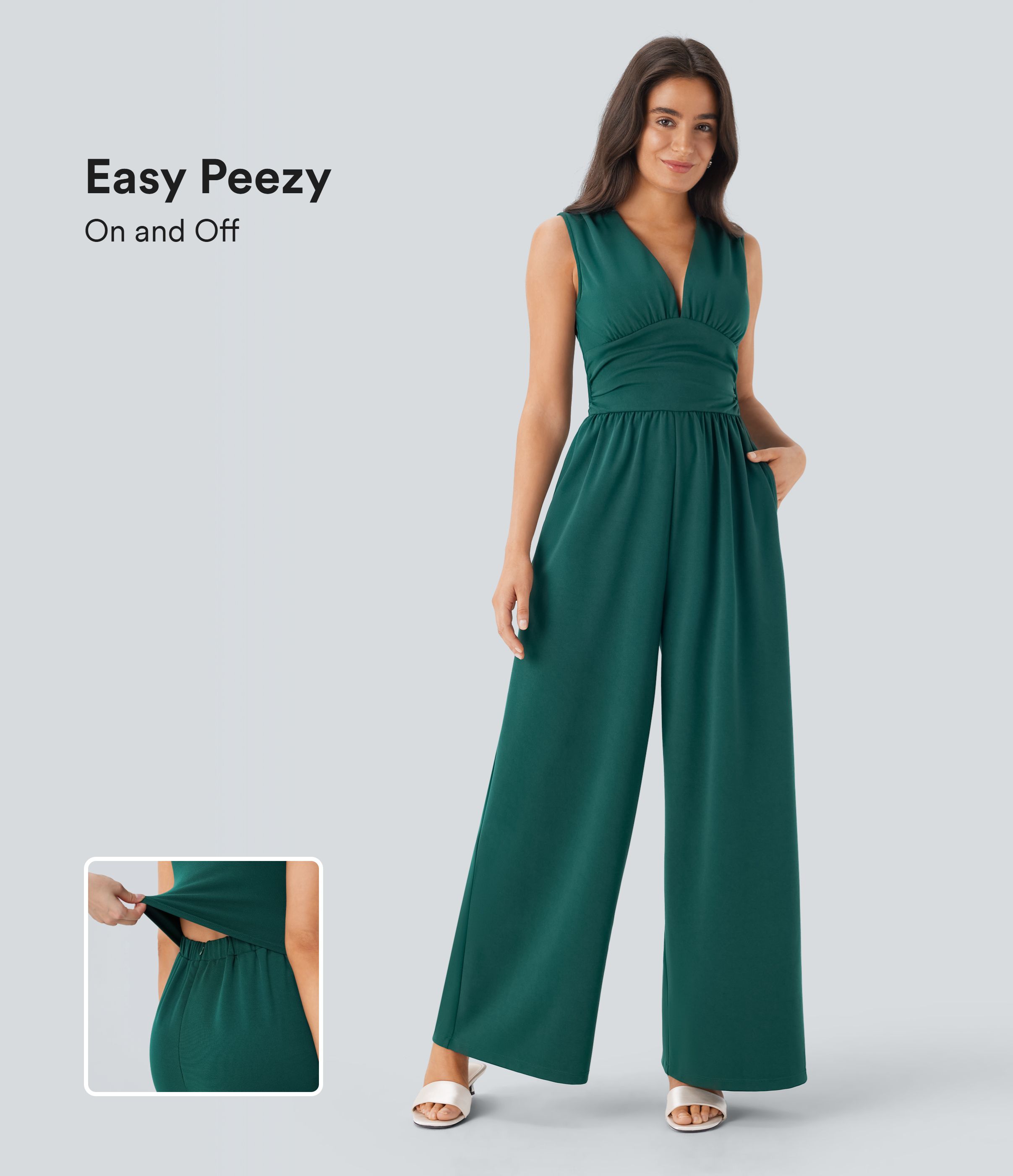 V Neck Sleeveless Ruched Pocket Jumpsuit-Easy Peezy
