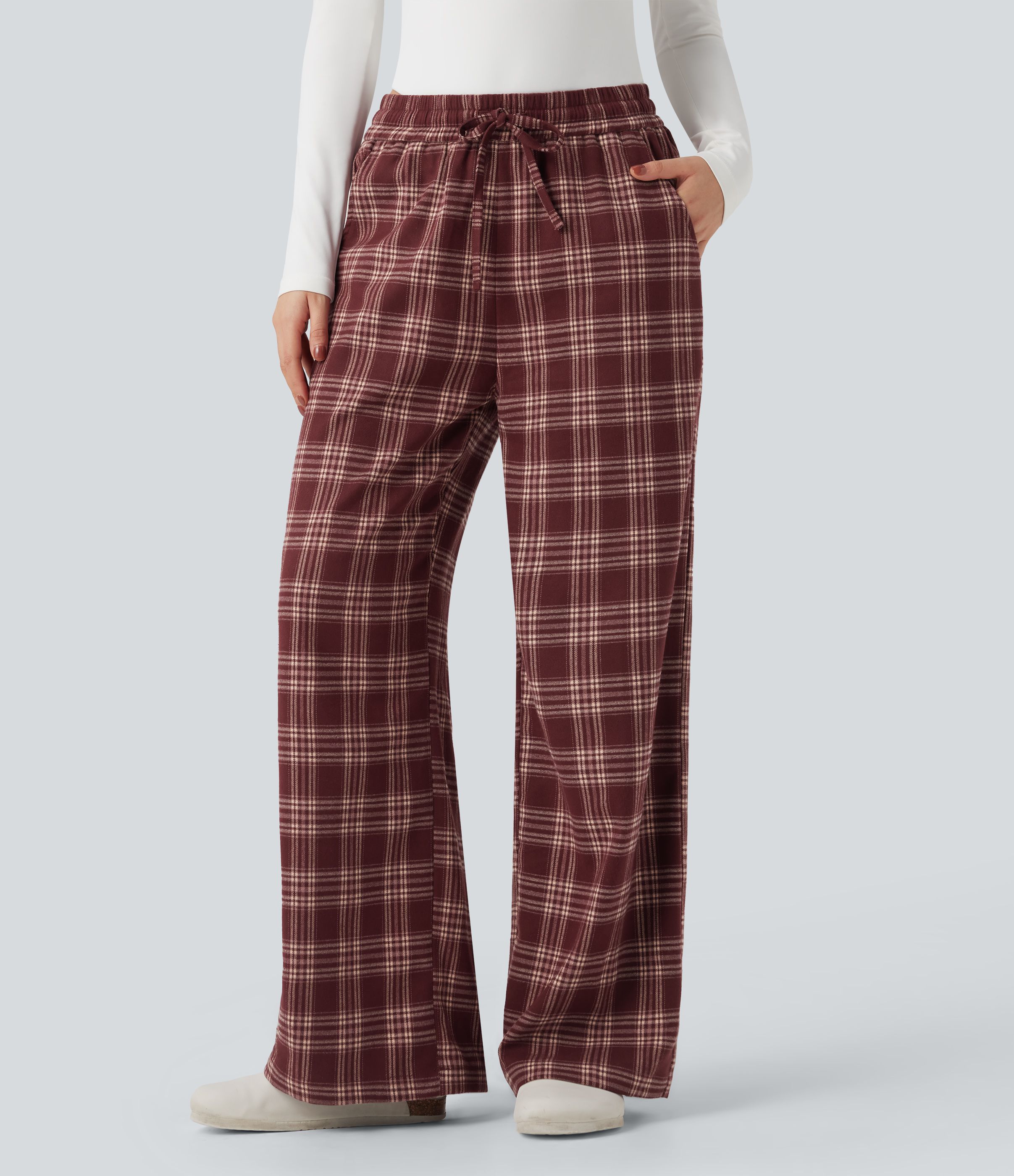 High-waisted Plaid Print Casual Baggy Pants with Pockets
