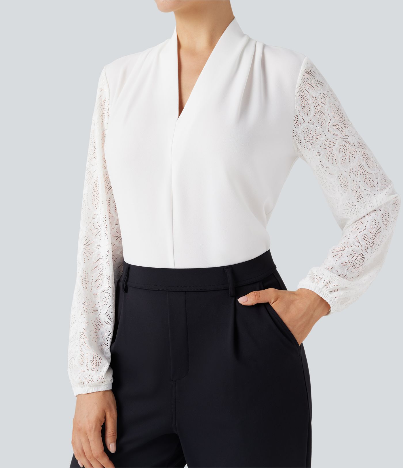 V-neck Long Sleeve Contrast Lace Work Blouse