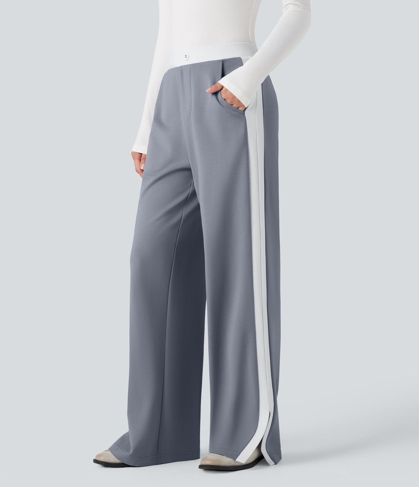 Mid Rise Color Block Split Work Straight Leg Pants with Pockets