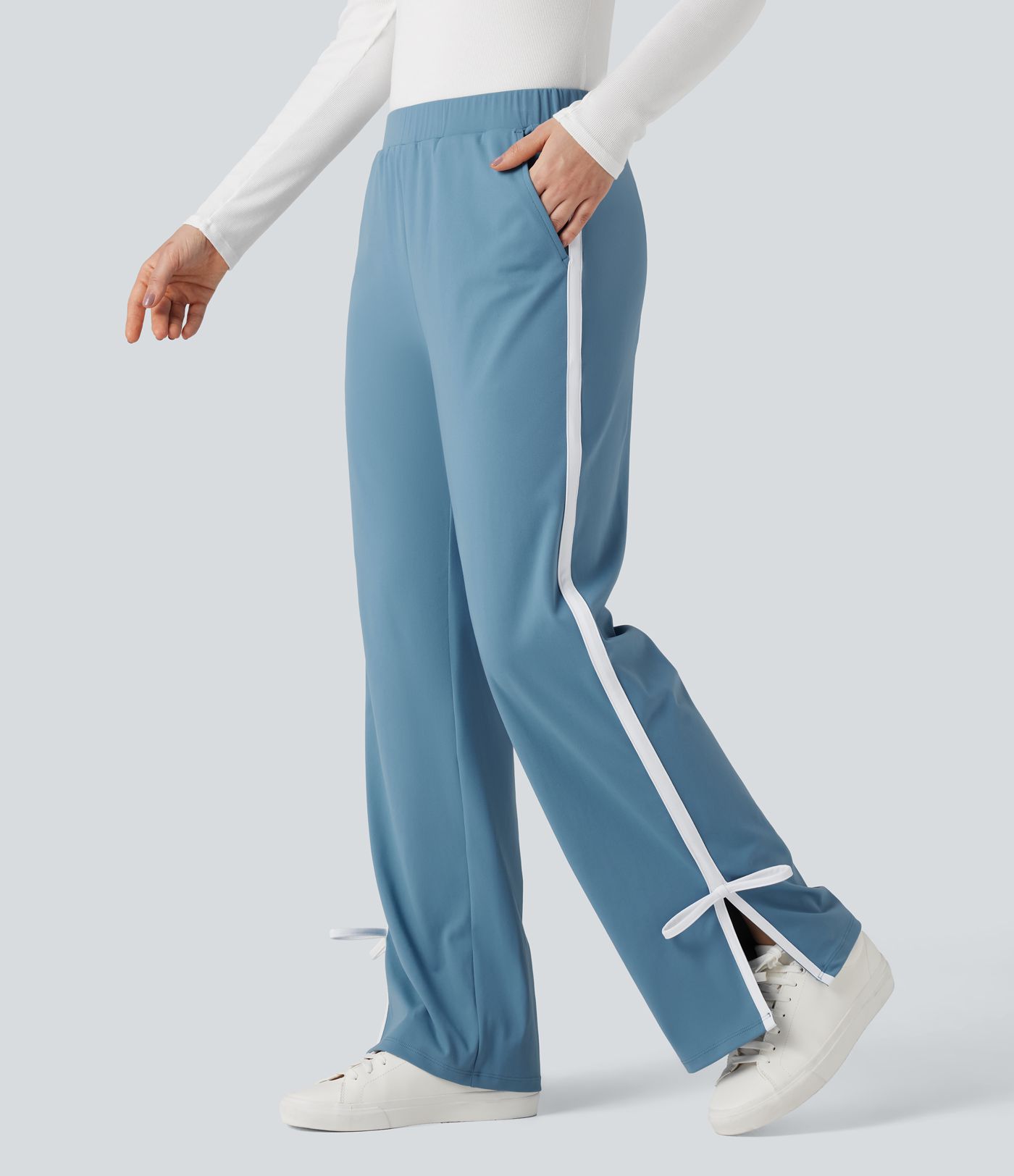 Mid Rise Side Stripe Split Bow Casual Straight-leg Pants with Pockets