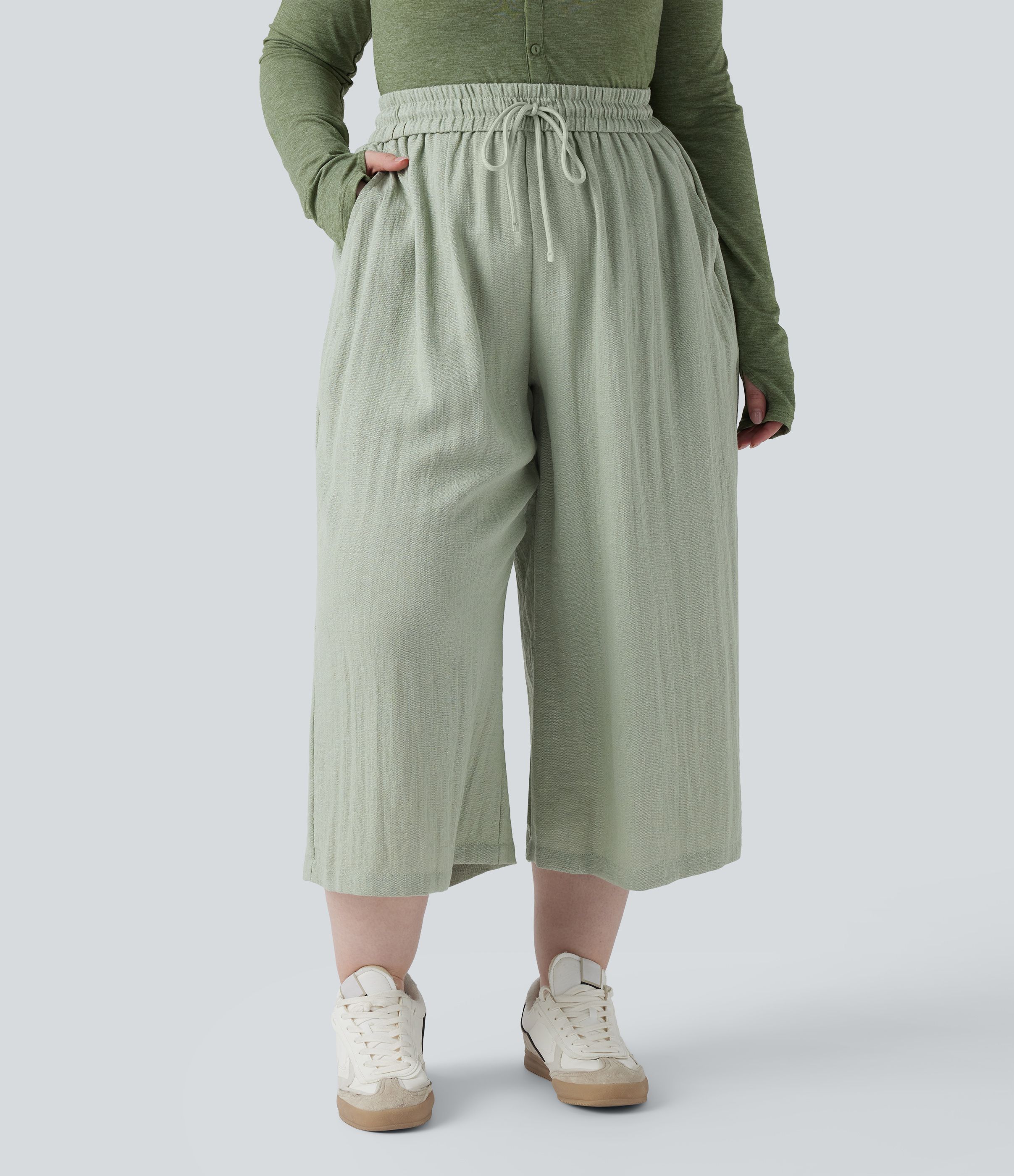 High Waisted Drawstring Wide Leg Cropped Casual Linen-Feel Plus Size Pants with Pockets