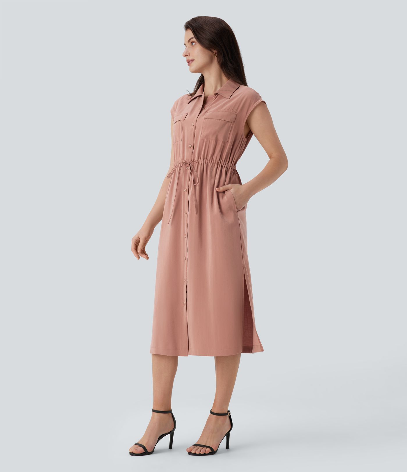 Sleeveless Pockets Drawstring Midi Work Shirt Dress