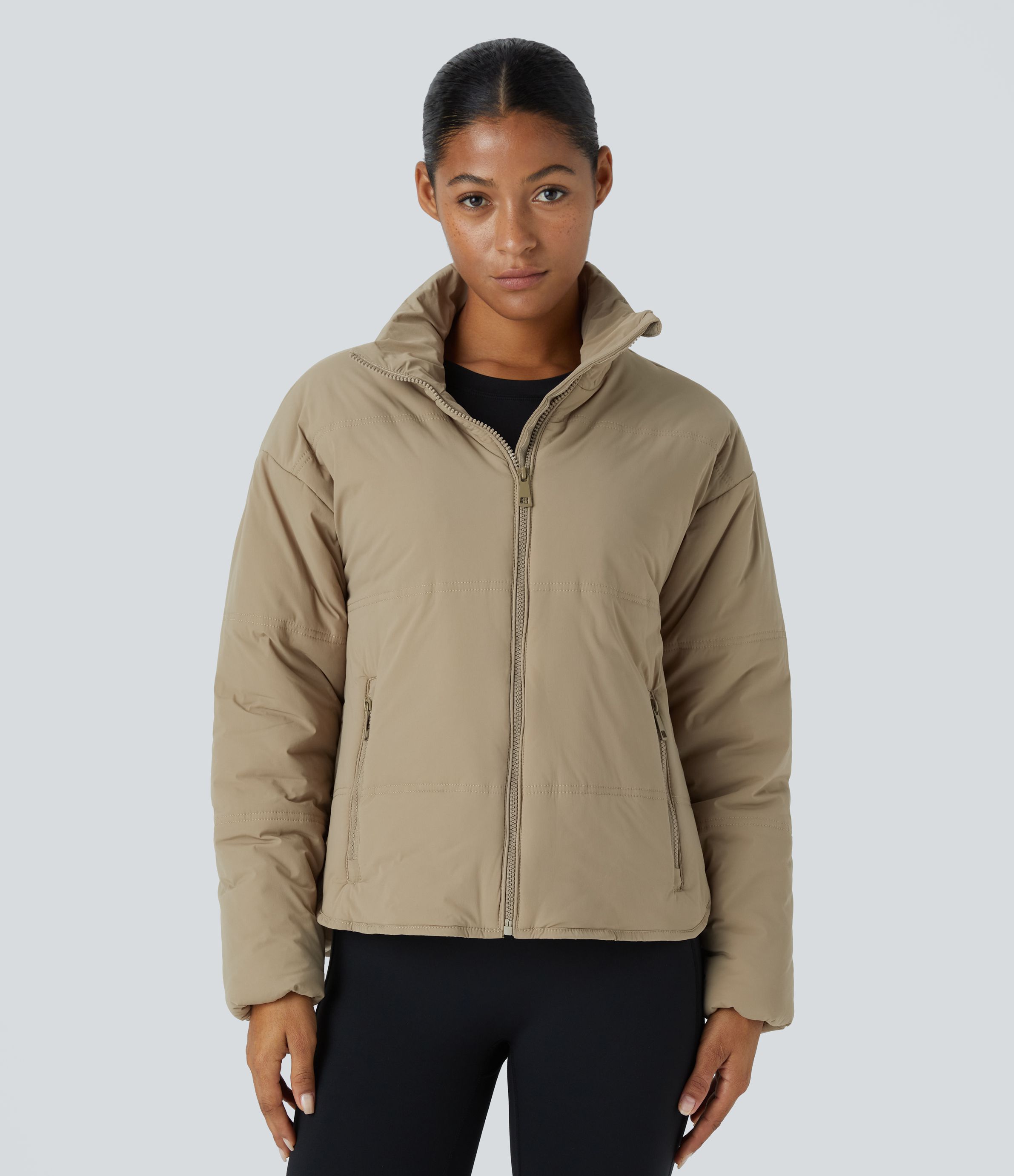 Funnel Neck Pockets Zipper High Low Curved Hem Relaxed Hiking Padded Jacket