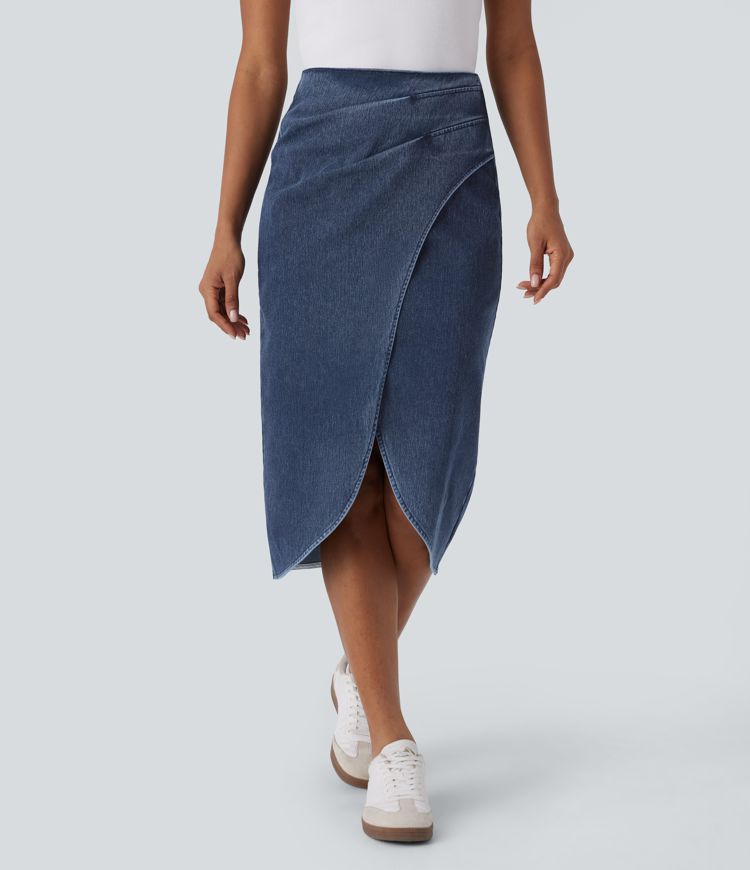 Halara Flex™ High Waisted Back Zipper Ruched Tulip Hem Midi Washed Denim Women Casual Skirt