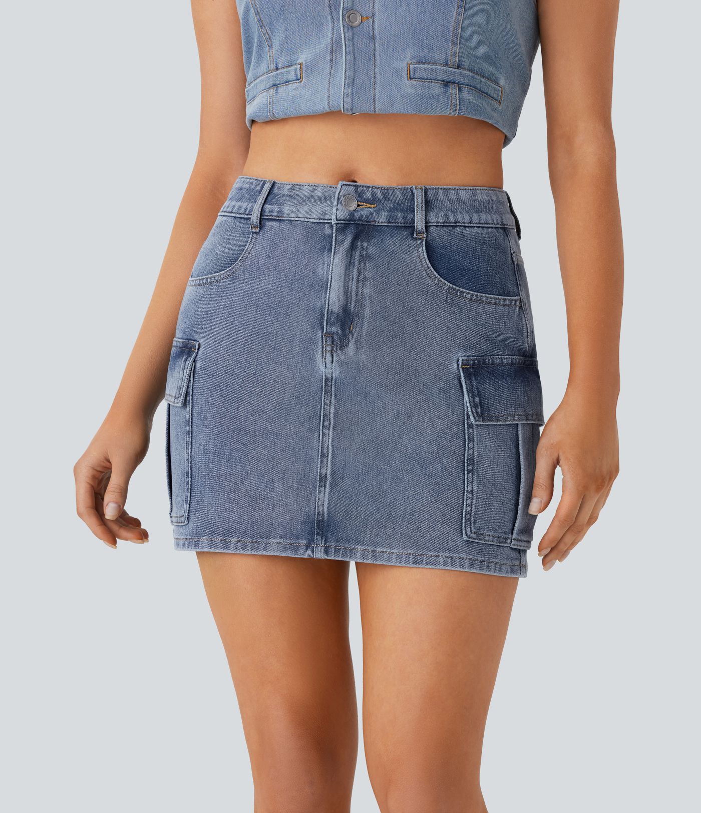 Halara Flex™ Mid Rise Zipper Pockets Denim Mini Casual Cargo Skirt