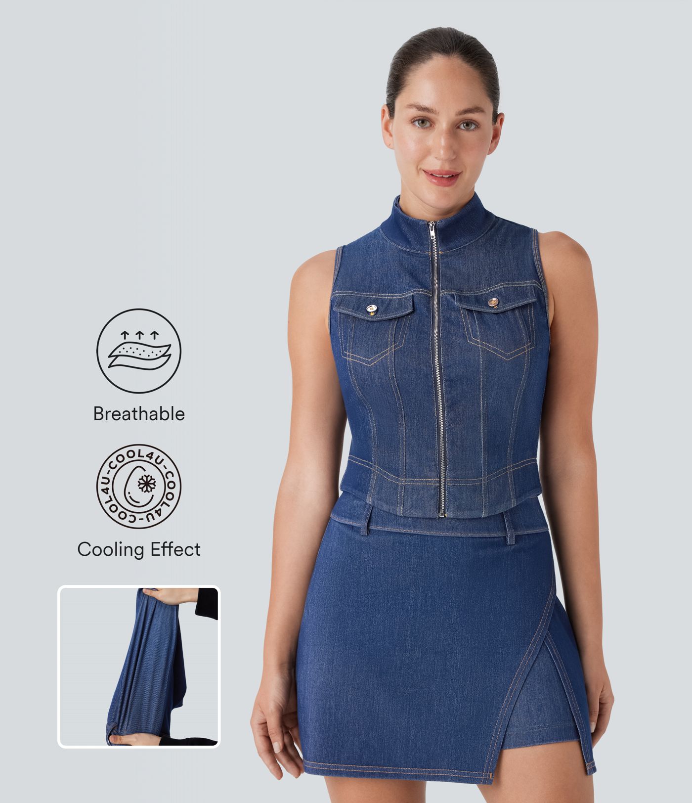 Halara Flex™ Stand Collar Zipper Cool Touch Washed Denim Tennis Tank Top