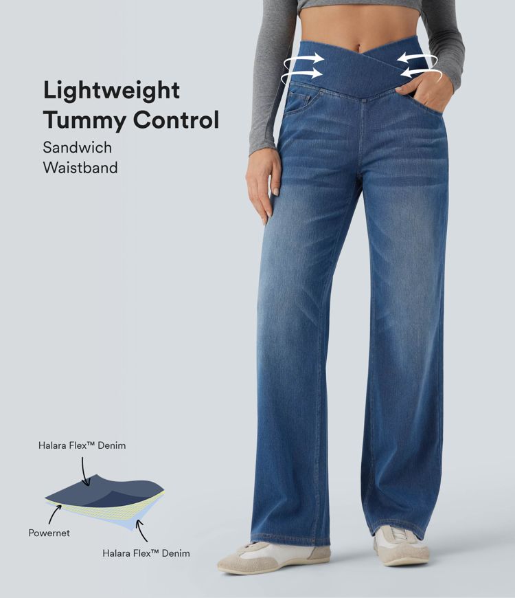 Halara Flex™ Crossover High Waisted Shaping Tummy Control Casual Women Straight Leg Denim Jeans with Pockets