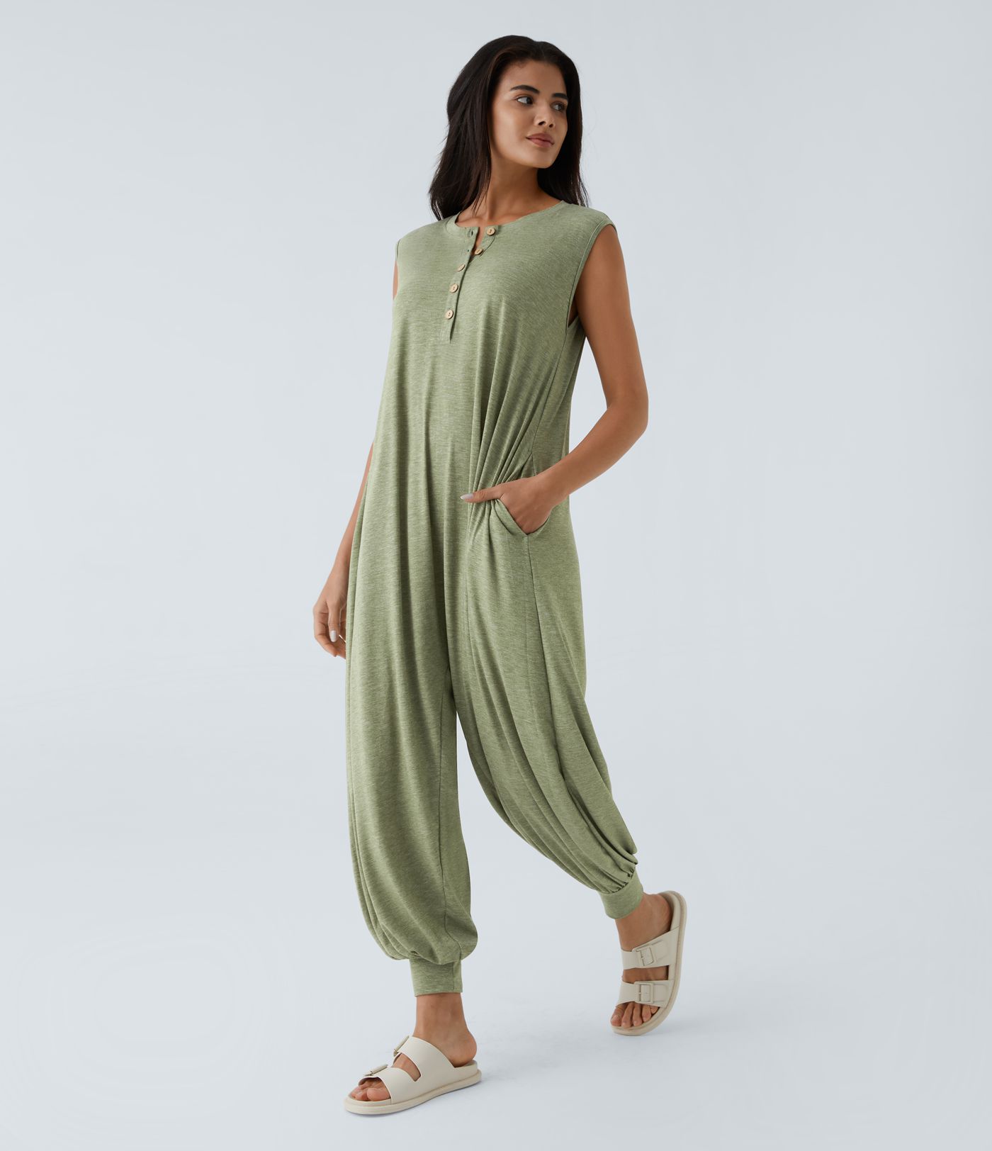 Henley Neck Sleeveless Pocket Relax Harem Jumpsuit