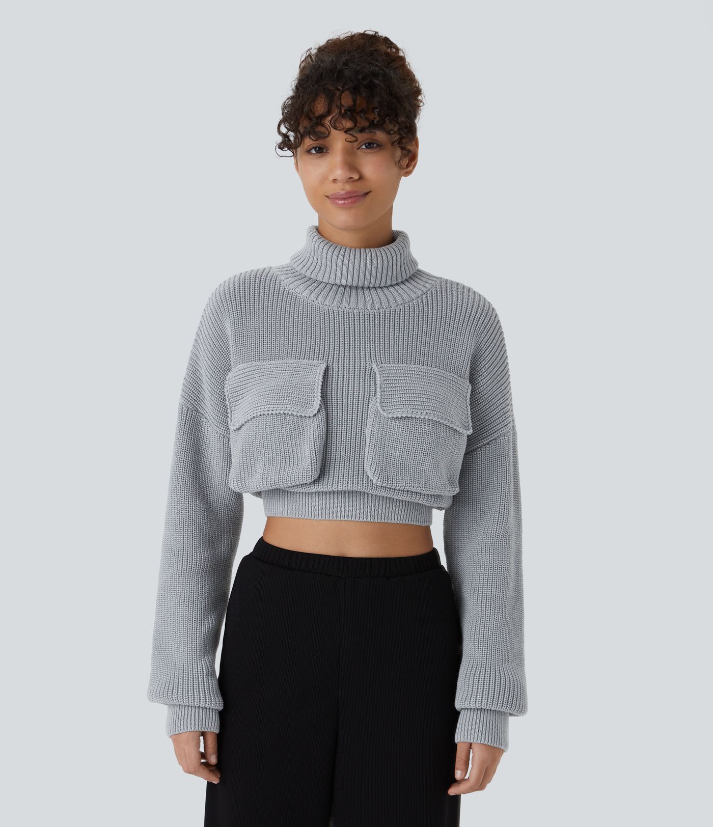 High Neck Dropped Shoulder Flap Pocket Cropped Casual Sweater