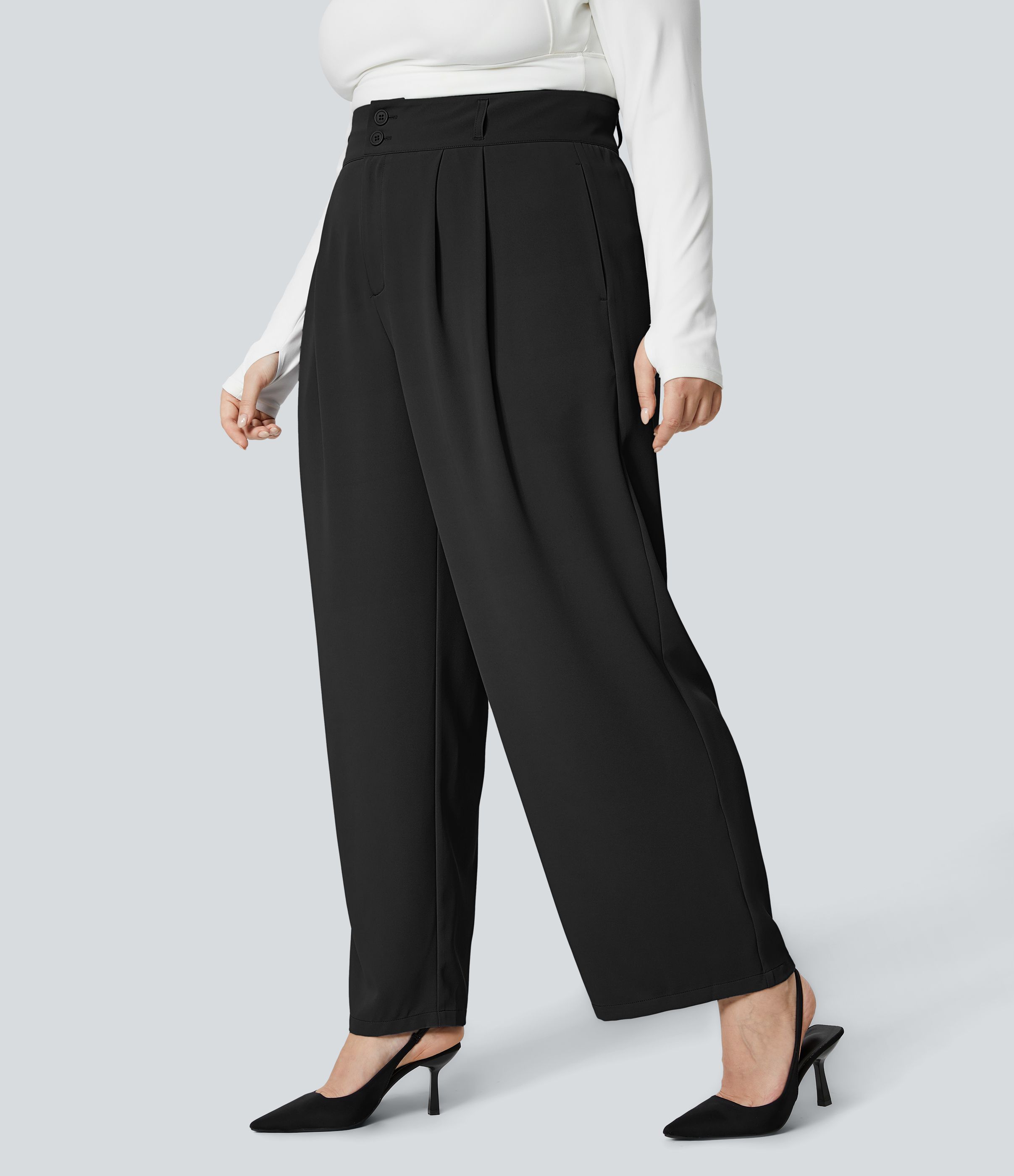 High Waisted Zipper Pocket Shirred Straight Leg Work Plus Size Pants