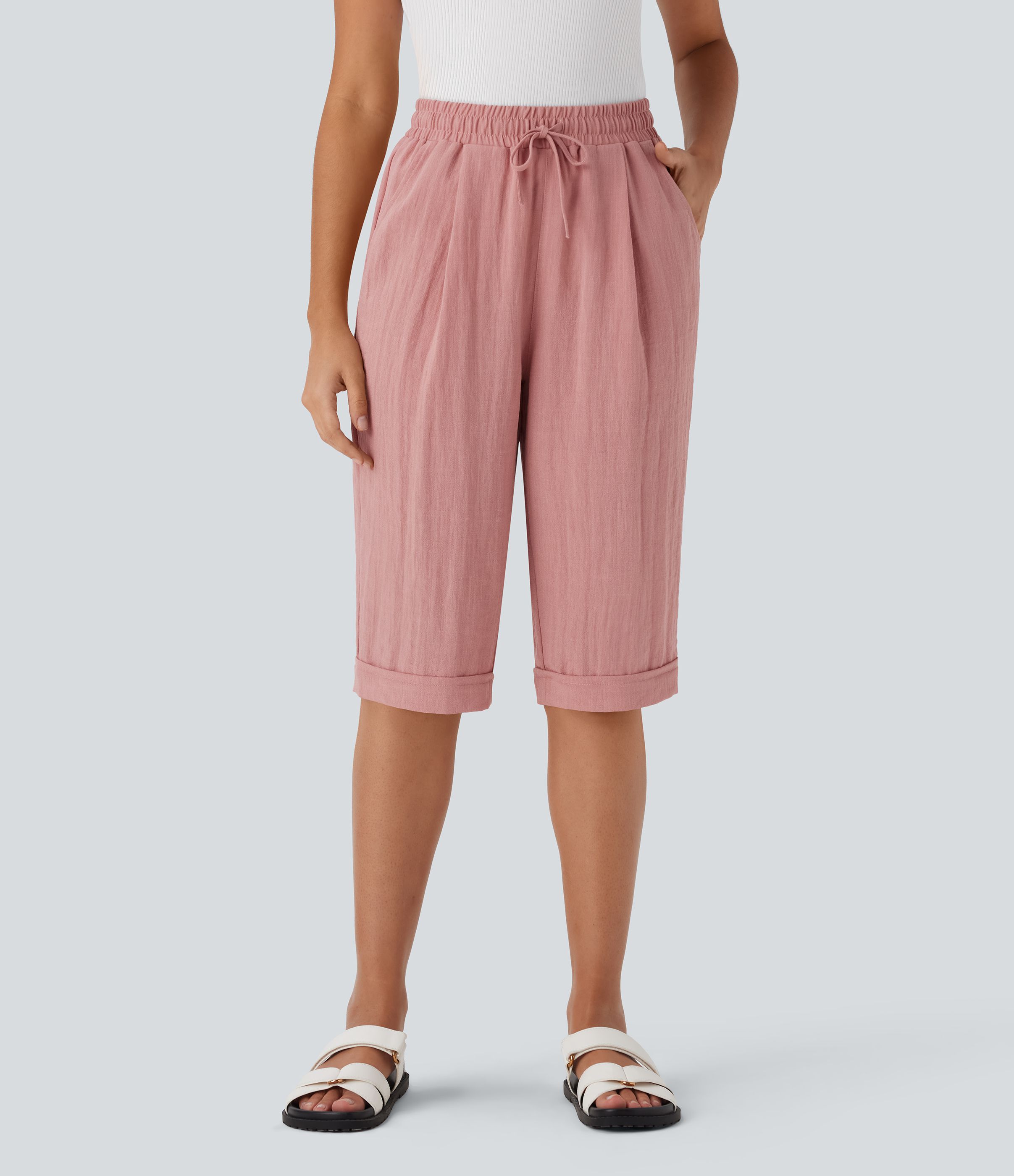 High Waisted Drawstring Pocket Pedal Pusher Casual Linen-Feel Pants