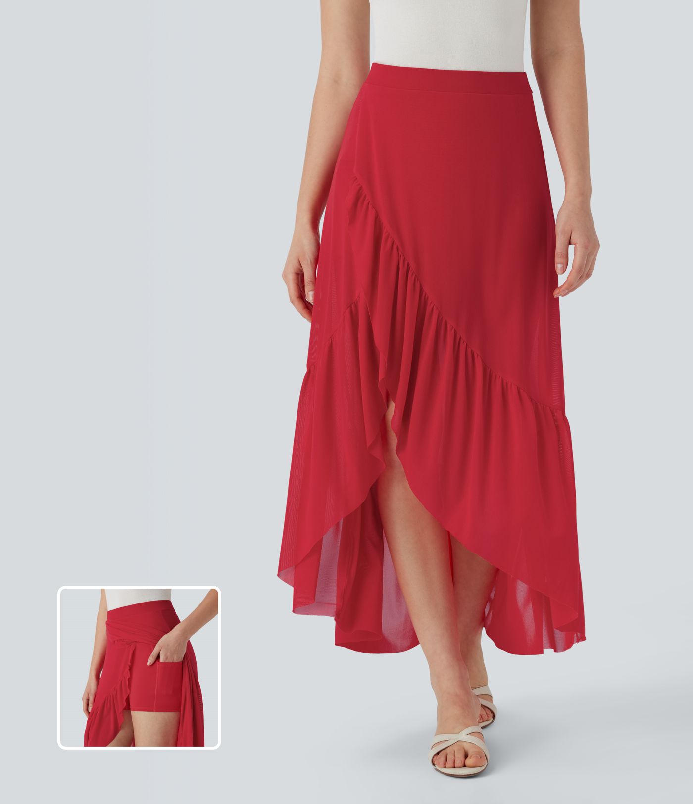 High Waisted High Low Ruffle Hem 2-in-1 Pocket Flowy Mesh Midi Casual Skirt