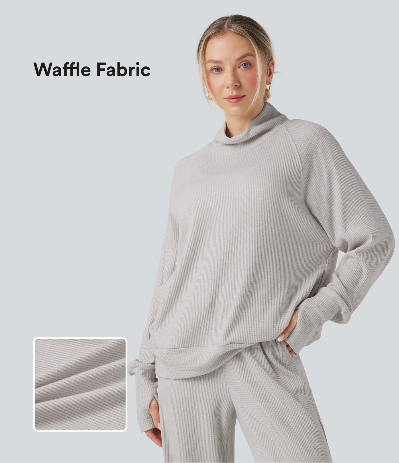 High-neck Long Sleeve Thumb Holes Oversized Waffle Casual Sweatshirt with Pockets