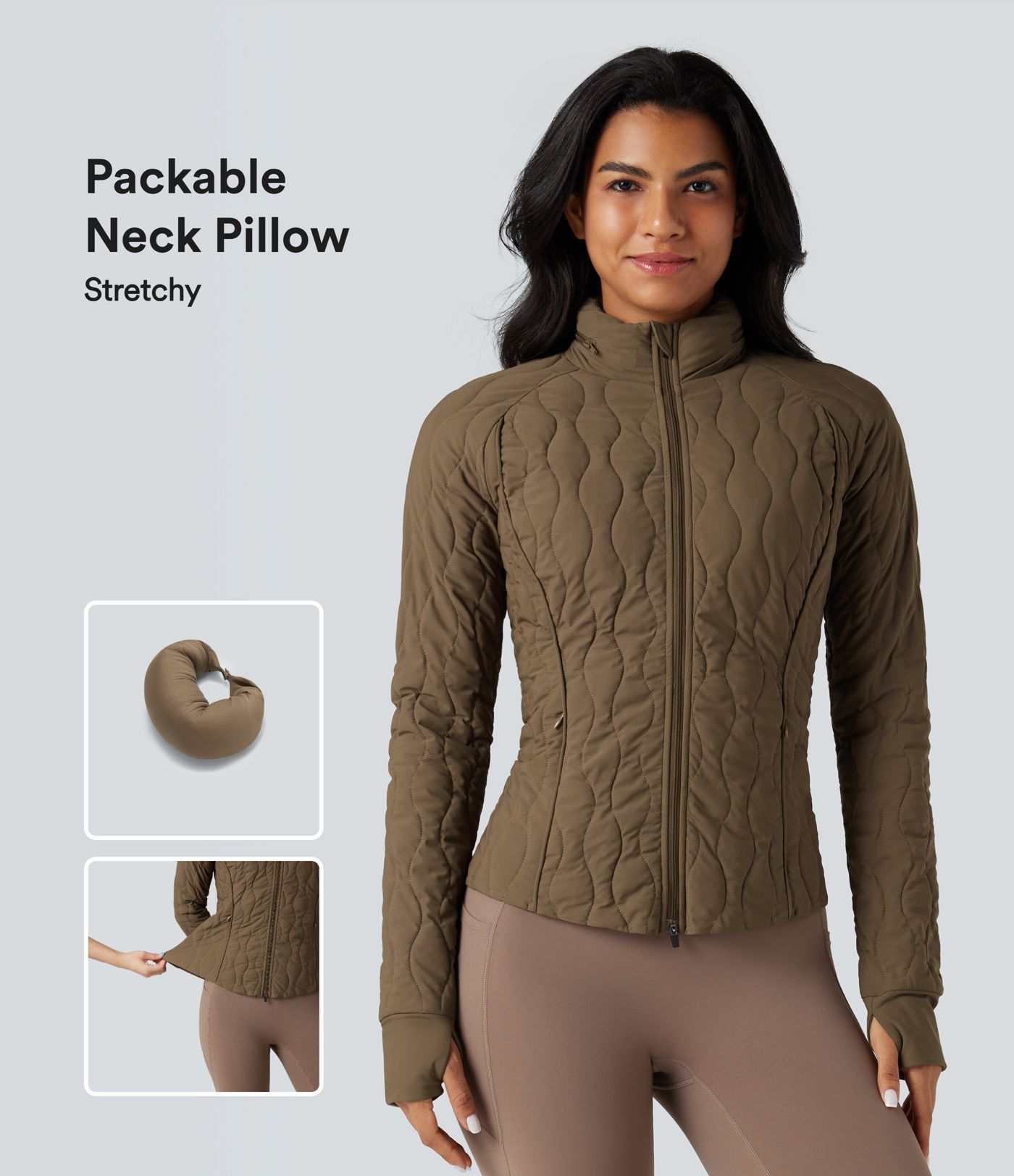 High-neck Thumb Holes Stretchy Workout Padded Jacket with Pockets-Packable Neck Pillow