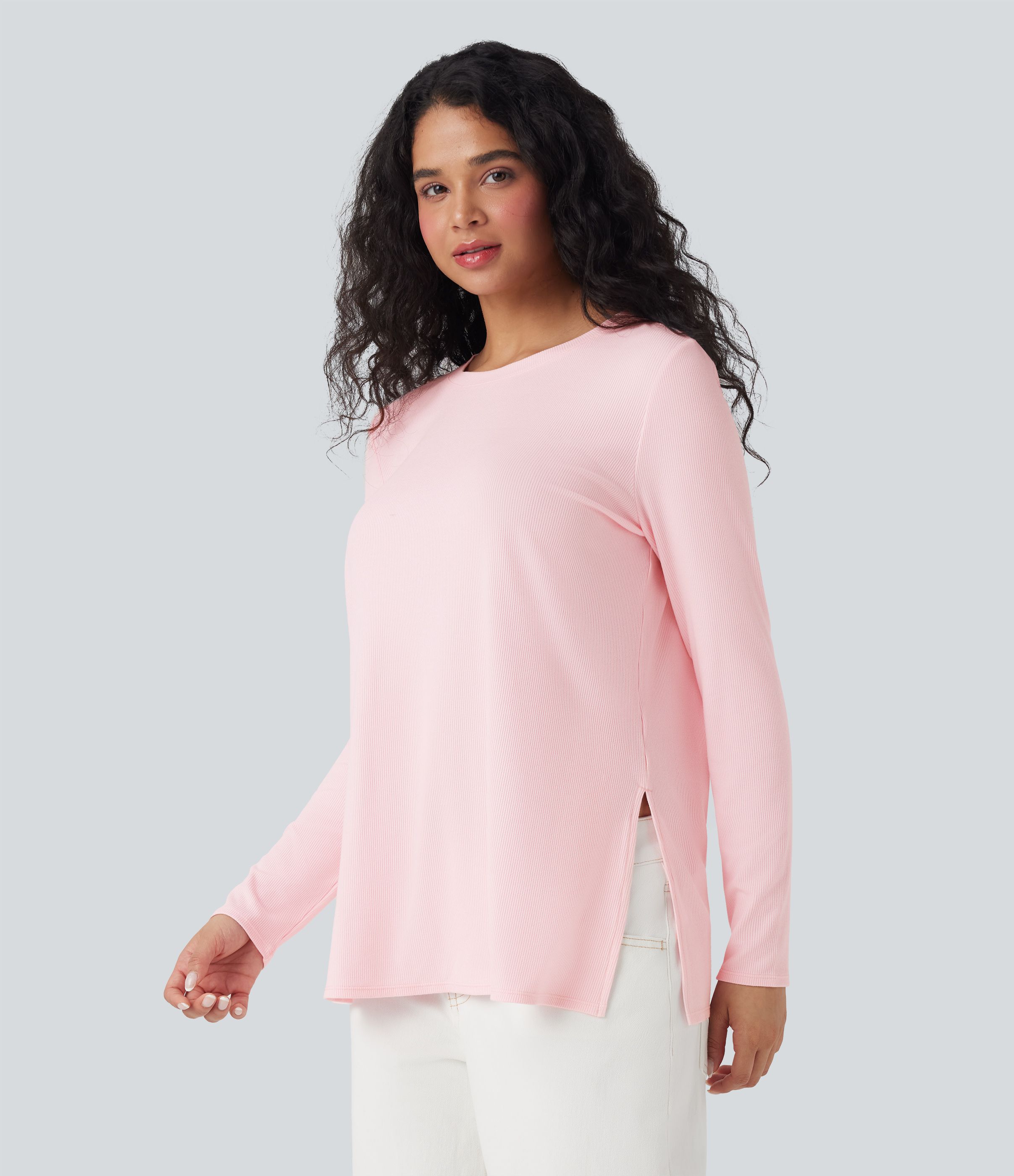 Ribbed Knit Long Sleeve Split Hem Casual T-Shirt
