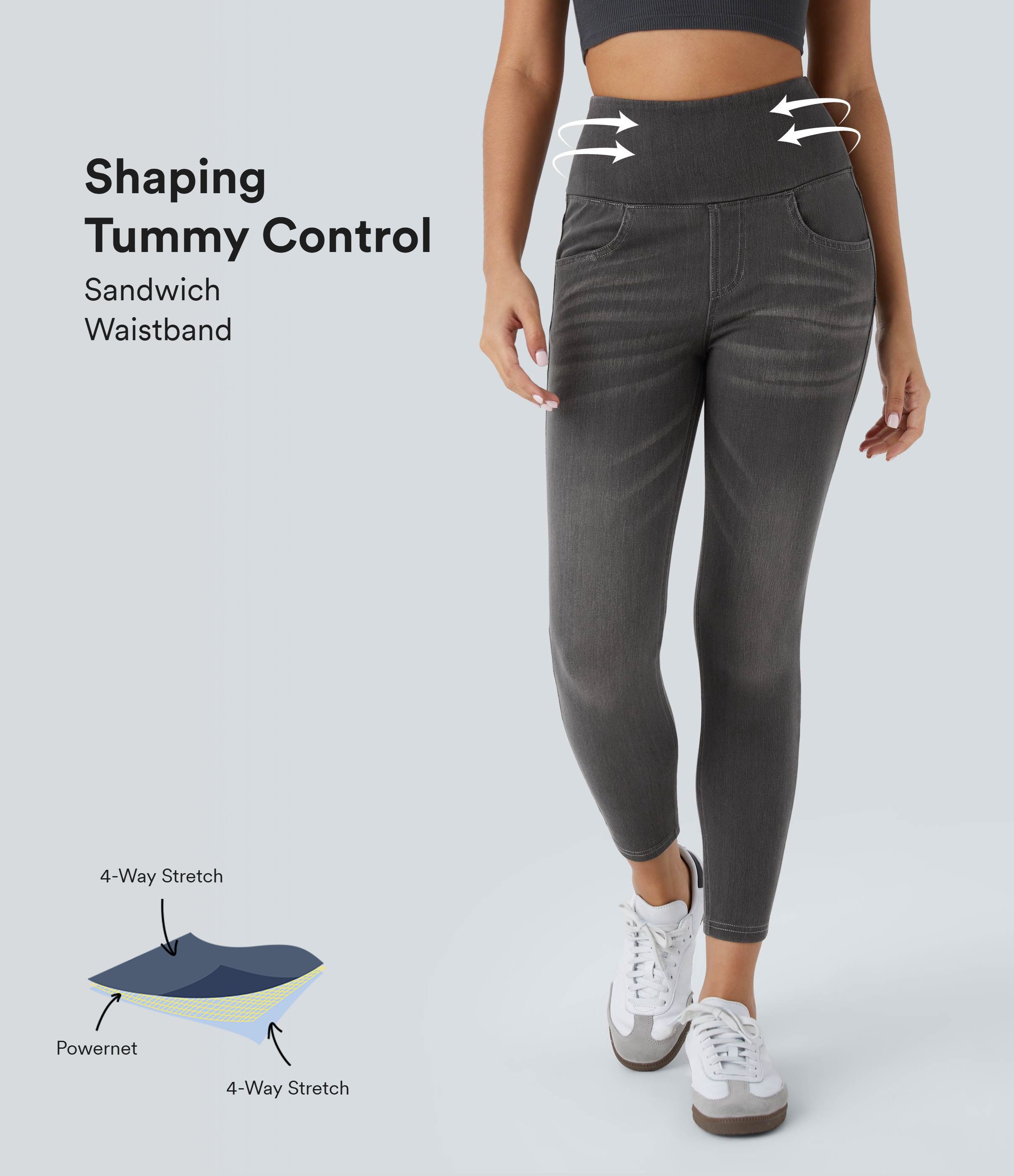 High Waisted Pockets Shaping Denim 7/8 Casual Leggings