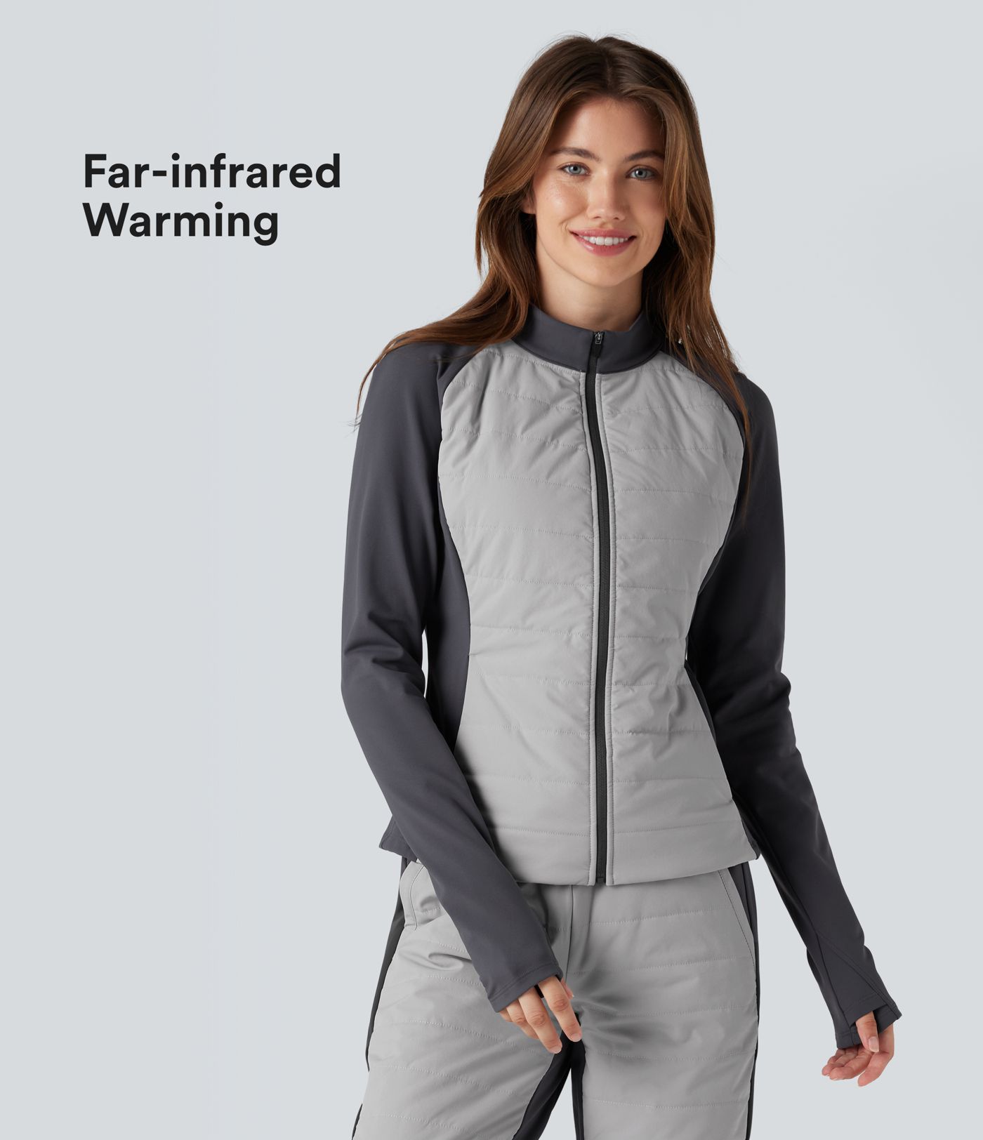 Stand Collar Thumb Holes Color Block Fleece Slim Hiking Padded Jacket with Pockets