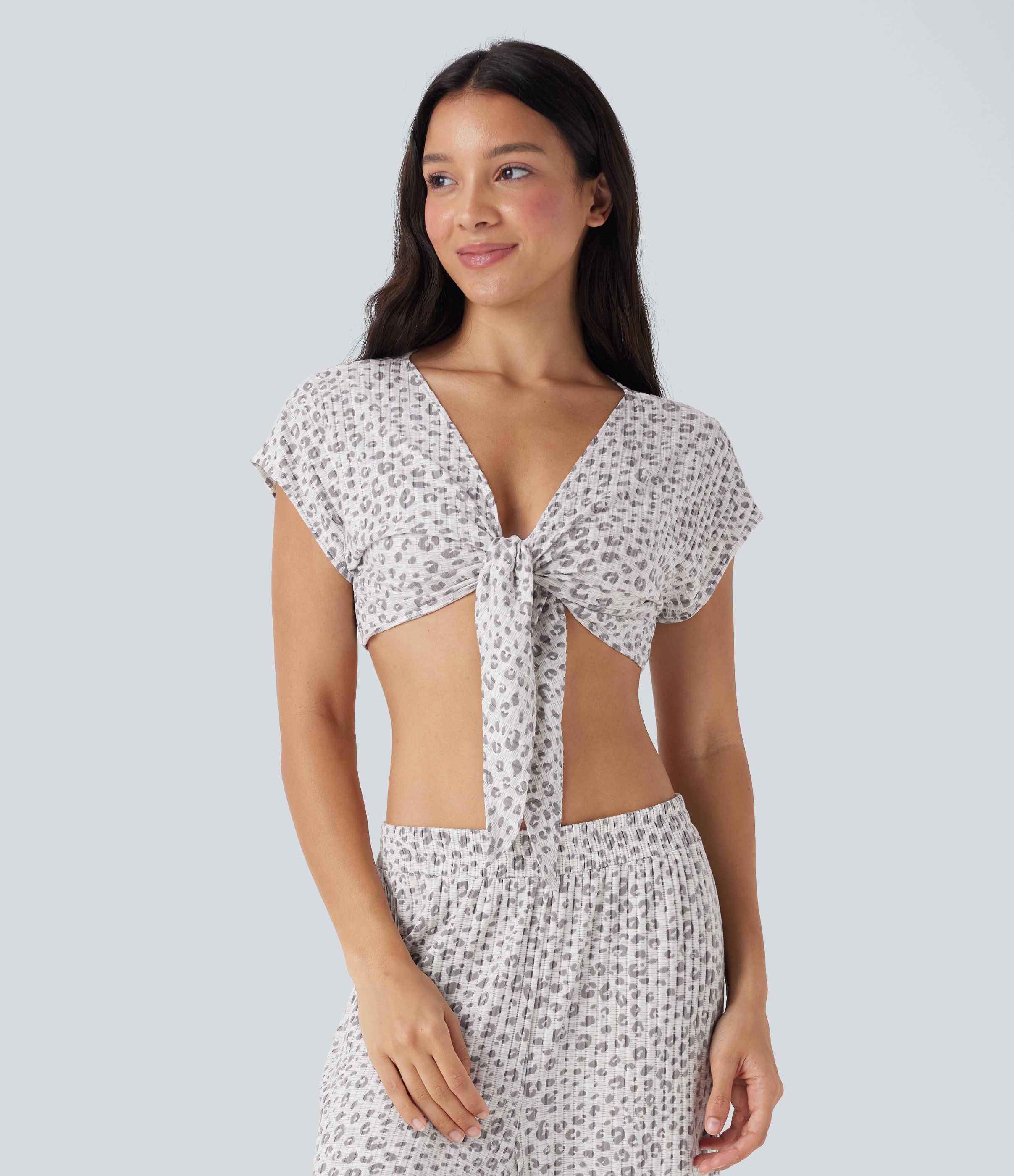 Tie Front Short Sleeve Leopard Print Cropped Lounge Top